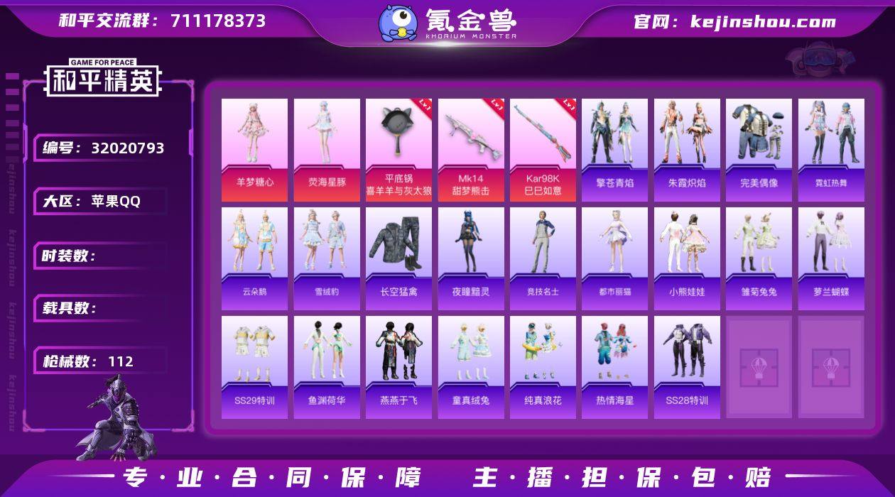 次协助处理】【因赛季更新游戏段付以上号为准!】 苹果Q-2粉装6特效枪52套装112枪皮 9印记 历史绝世王牌31星 【2粉装】 荧海星豚 羊梦糖心 【6特效枪】 Kar98K-巳巳如意 (5级) MG-36-沧焰双生 (5级) DP-28-豹影疾电 (5级) Mk14-甜梦熊击 (5级) ACE32-萌骑漫游 (5级) 平底锅-喜羊羊与灰太狼 (7级) 【1飞行器】 幻海精灵飞行器 【1头盔】 深海小丑鱼头盔