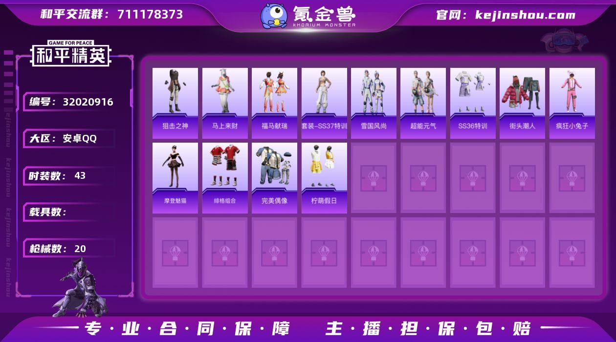 实名:不可二次实名 是否支持人脸包赔:支持 时装数:43 枪械数:20 狙击之神,马上来财,福马献瑞,SS37特训,雪国风尚,超能元气,SS36特训,绯格组合,疯狂小兔子,街头潮人,摩登魅猫,柠萌假日,完美偶像