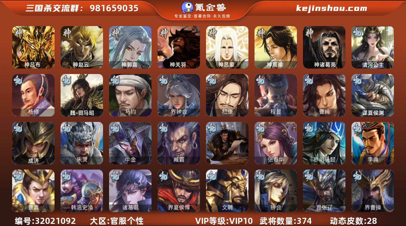 官阶: 大将军 VIP等级: VIP10 武将数量: 374 动态皮肤数量: 28 神将: 神郭嘉,神吕布,神赵云,神关羽,神吕蒙,神周瑜,神诸葛亮 魏国武将: 曹纯,程昱,嵇康,界钟会,马钧,魏-司马昭,杨修,徐庶,张辽,SP曹仁,SP关羽,SP贾诩,SP姜维,SP庞德,卞夫人,蔡贞姬,曹昂,曹操,曹冲,曹洪,曹丕,曹仁,曹叡,贾逵,王异,张恭,鲁芝,界满宠,曹休,界曹植,满宠,荀攸,王基,钟繇,蒯越蒯良,郭嘉,荀彧,阮慧,杜畿,界郭嘉,崔琰,界曹丕,界荀彧,朱灵,辛毗,吕虔,界陈群,界王异,界许褚,界郭淮,华歆,陈群,界邓艾,界典韦,谋甄姬,袁涣,李通,乐进,辛宪英,郭淮,夏侯惇,曹植,司马朗,谋于禁,界曹操,许褚,界张辽,谋徐晃,张郃,钟会,文聘,曹彰,界夏侯惇,诸葛诞,司马懿,甄姬,徐晃,韩浩史涣,曹真,典韦,夏侯渊,李典,于禁,邓艾,界司马懿,张春华,孟达-魏,臧霸,牛金,朱灵(国战),成济,清河公主,谋夏侯渊 蜀国武将: 关索,花鬘,界黄忠,沙摩柯,张星彩,赵襄,周群,诸葛瞻,谋马超,马云騄,徐庶,界魏延,杨仪,吕凯,界关羽,界诸葛亮,邓芝,胡金定,严颜,界黄月英,界张嶷,赵云,张松,彭羕,李丰,界刘备,谋法正,谋姜维,刘封,糜竺,谋庞统,黄月英,刘巴,关羽,吴懿,界吴懿,界廖化,向宠,祝融,张飞,黄皓,魏延,界周仓,马忠,界法正,糜夫人,界孟获,刘禅,界赵云,界姜维,张翼,关银屏,界祝融,SP孙尚香,SP徐庶,卧龙诸葛,宗预,周仓,简雍,界关兴张苞,诸葛亮,孙乾,界张飞,界卧龙诸葛,法正,界简雍,赵统赵广,陈到,界马岱,关平,马岱,界庞统,庞统,诸葛果,马谡,马超,霍峻,廖化,关兴张苞,孟获,秦宓,吴苋,夏侯氏,姜维,黄忠,刘备,界马超,李严,马良,傅肜,蒋琬费祎,刘谌,蜀-孟达,彭羕(国战),甘夫人,SP甘夫人 吴国武将: 贺齐,界步练师,界徐盛,界朱然,留赞,骆统,潘濬,陆绩,张温,周泰,吕蒙,诸葛恪,界孙尚香,界顾雍,大乔小乔,桥公,谋周瑜,丁奉,谋吕蒙,周鲂,界全琮,孙茹,薛综,蒋钦,顾雍,阚泽,孙亮,界朱治,孙休,严畯,界孙权,...