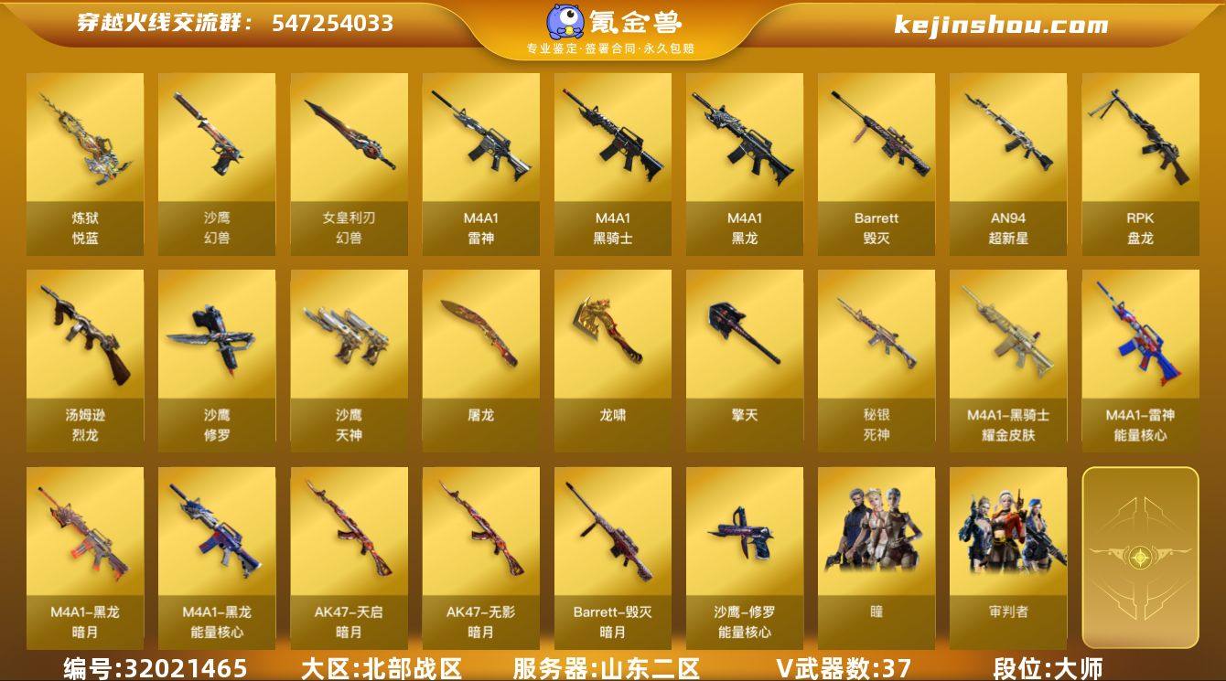山东一区-15V-1王者武器数-0炫金武器数 【热门武器】:M200-幻神,M4A1-黑骑士 【音效卡】:Barrett-毁灭音效卡,Barrett-碧霄极光音效卡,AWM-昌龙-怀旧音效卡 【皮肤】:M200-幻神-黄忠皮肤,幻神-电竞之星 皮肤,雷神-源计划2.0专属 皮肤,火麒麟-雷神,火麒麟-战神关羽,毁灭-战神张飞,毁灭-英雄计划 皮肤,黑骑士-战神马超,无影-能量核心,战神-流金岁月皮肤 【角色】:战地猎狐,奇洋探员,乔伊教练,云海玲珑,暗夜-X,北极狐-X,嘉年华灵狐,娟娟,龙儿,潘多拉-X,斯沃特-X,游珑儿 【人偶武器】:AWM-灵狐-15周年嘉年华*2,迷你深渊冰龙,迷你波特博士,生化手雷-机甲核心,迷你巨石泰坦-魔花研究所,灵狐娃娃手雷 【暴走生化】:超级对讲机 【挑战大师】:神圣爆裂者-末日III 【英雄级武器】:AK47-火麒麟,M4A1-雷神*2,M4A1-黑骑士,无影-神兵利器,黑武士-锦绣游龙,Barrett-毁灭,M200-幻神,M4A1-赤狱骑士,M4A1-苍鸣雷神,Barrett-碧霄极光 【道具】:BS战队炫彩背包,CFS限定背包,云山科技背包,亚洲杯纪念炫彩背包,全能枪王背包,炫彩背包-诺拉,超级背包,女皇终结者-魔龙之吻,救世主-黑桃战神,绿色巨人,灵魂忍者*2,迷雾幽灵,生化弹匣,夺命之镰,防化服*3,金色流光-枪王排位*2,星辰流光-枪王排位,流光-鎏金之域,流光-再燃火线,枪王排位28赛季金色流光,枪王排位29赛季金色流光,动感闪耀表情,EP战队名片,EP战队喷图,防弹头盔*3,防弹衣*3,C4工具钳*3,手雷包*3 【特殊枪械】:1黑骑士