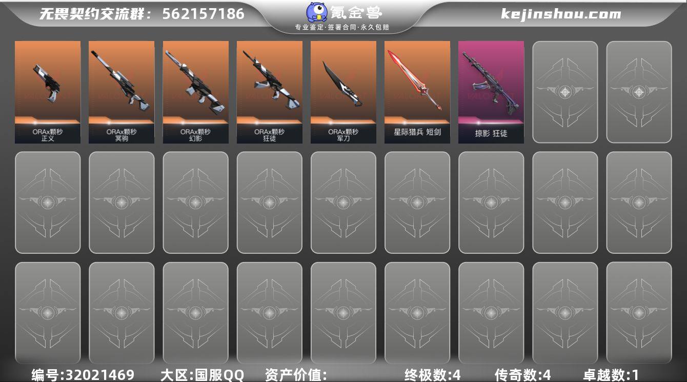 【套装】:ORA x 颗秒套装【英雄】:炼狱,维斯,暮蝶,壹决,捷风,雷兹,不死鸟,贤者,猎枭,蝰蛇,零,芮娜,奇乐,尚勃勒,霓虹,夜露,K/O,盖可,黑梦【近战武器】:近战武器-碎心裂刃,近战武器-ORA x 颗秒 军刀,近战武器-星际猎兵 短剑【狂徒】:狂徒-ORA x 颗秒,狂徒-掠影【幻影】:幻影-ORA x 颗秒【冥驹】:冥驹-ORA x 颗秒【正义】:正义-ORA x 颗秒【卡面】:模拟赫兹 卡面,Clutch 卡面,无畏契约GO!第一卷:零 卡面,战术小伙伴 卡面,代号红色 卡面,新兵报到 卡面,V契约 卡面,无畏契约 卡面【喷漆】:买装还是存钱 喷漆,胜利属于无畏契约 喷漆,GLHF 喷漆,无畏契约 喷漆【挂饰】:天外飞客 挂饰,无畏契约 纪念币 挂饰