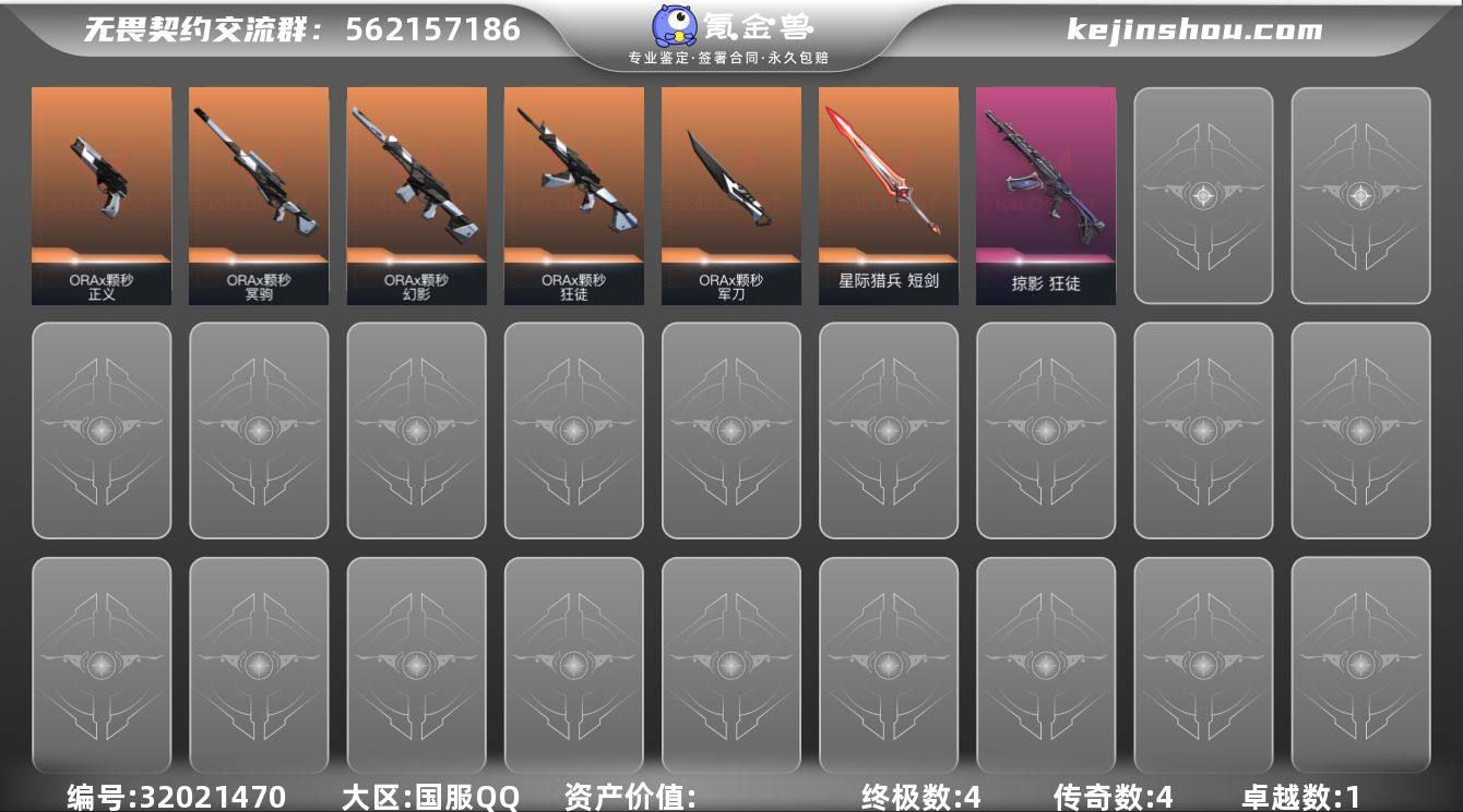 【套装】:ORA x 颗秒套装【英雄】:炼狱,维斯,暮蝶,壹决,捷风,雷兹,不死鸟,贤者,猎枭,蝰蛇,零,芮娜,奇乐,尚勃勒,霓虹,夜露,K/O,盖可,黑梦【近战武器】:近战武器-碎心裂刃,近战武器-ORA x 颗秒 军刀,近战武器-星际猎兵 短剑【狂徒】:狂徒-ORA x 颗秒,狂徒-掠影【幻影】:幻影-ORA x 颗秒【冥驹】:冥驹-ORA x 颗秒【正义】:正义-ORA x 颗秒【卡面】:模拟赫兹 卡面,Clutch 卡面,无畏契约GO!第一卷:零 卡面,战术小伙伴 卡面,代号红色 卡面,新兵报到 卡面,V契约 卡面,无畏契约 卡面【喷漆】:买装还是存钱 喷漆,胜利属于无畏契约 喷漆,GLHF 喷漆,无畏契约 喷漆【挂饰】:天外飞客 挂饰,无畏契约 纪念币 挂饰
