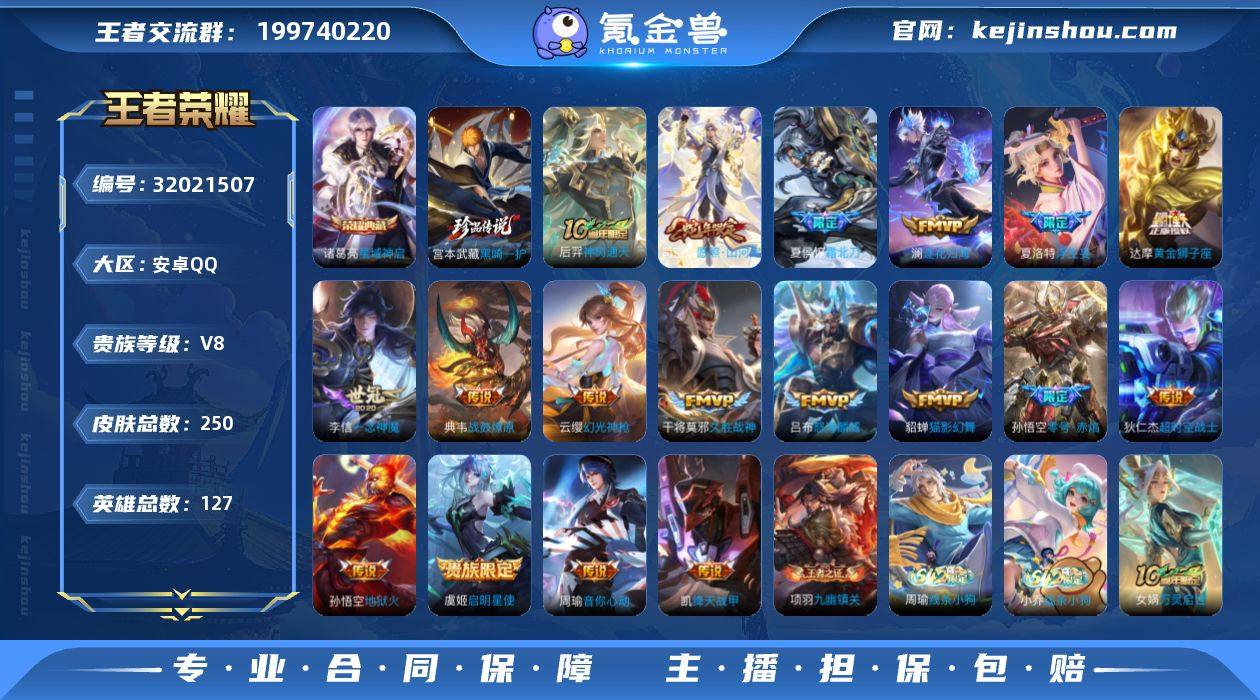安卓Q-V8-最强王者段位-127英雄-250皮肤-1典藏皮肤-1珍品传说-21传说-78史诗【英雄全皮】:孙权全皮,敖隐全皮,影全皮【荣耀典藏】:诸葛亮星域神启【珍品传说】:宫本武藏黑崎一护【传说皮肤】:韩信踏浪归,关羽神骥镇沧海,狄仁杰神骥赴朔漠,后羿神树通天,司空震愿照山河定,云缨幻光神枪,夏侯惇霜北刀,典韦战鼓燎原,澜逐花归海,夏洛特浮生妄,吕布怒海麟威,周瑜音你心动,铠绛天战甲,虞姬启明星使,孙悟空零号赤焰,李信一念神魔,貂蝉猫影幻舞,干将莫邪久胜战神,达摩黄金狮子座,孙悟空地狱火,狄仁杰超时空战士【限定皮肤】:夏侯惇霜北刀,蔡文姬夏日便利店,虞姬夏日便利店,姜子牙天穹之誓,狄仁杰阴阳师,赵云皇家上将,墨子神迹守卫,庄周高山流水,高渐离玩趣恶龙,钟无艳超时空战士,扁鹊奇幻香踪,吕布御风骁将,元歌云间偶戏,元歌无心,甄姬落雪兰心,马可波罗暗影游猎,狄仁杰魔术师,狄仁杰万华元夜,达摩沙漠行僧,项羽海滩派对,老夫子醍醐杖,老夫子航海奇遇记,程咬金演武夺筹,兰陵王金庭之子,亚瑟潮玩骑士王,孙悟空零号赤焰,李元芳云中旅人,虞姬启明星使,钟馗驱傩正仪,杨戬潮玩骑兵,鬼谷子原初探秘者,鬼谷子五谷丰年,苏烈千军破阵,沈梦溪大漠名商,明世隐疑决卦,裴擒虎擒涛扼浪,米莱狄胡桃异想国,云中君纤云弄巧,猪八戒西部大镖客,上官婉儿梁祝,蒙犽狂想玩偶喵,鲁班大师探海日志,桑启海盐诗旅,夏洛特浮生妄,艾琳女武神,张良古海寻踪,鲁班七号蔬乡物语【年限皮肤】:吕布御风骁将,司空震愿照山河定【赛季限定】:明世隐疑决卦,老夫子醍醐杖,鬼谷子原初探秘者,狄仁杰万华元夜,程咬金演武夺筹,钟馗驱傩正仪,苏烈千军破阵,达摩沙漠行僧,兰陵王金庭之子,沈梦溪大漠名商,李元芳云中旅人,桑启海盐诗旅,裴擒虎擒涛扼浪,鲁班大师探海日志,张良古...