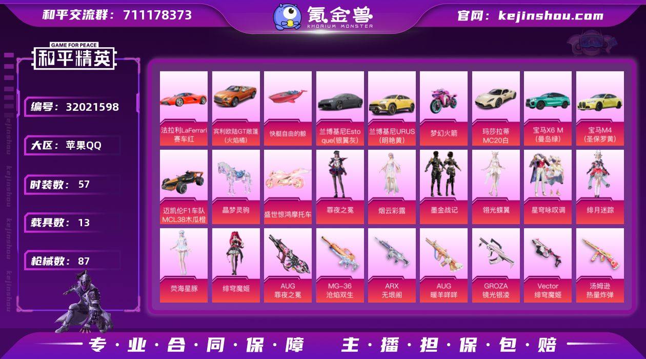 【和平精英】10粉装,17特效枪,15载具,历史最高段位:荣耀皇冠Ⅱ 王牌印记-1次 热力值:68868,97套装,124枪械,196装备,64战备;套装:盛世惊鸿-云鸾,角色-烟云彩露,套装-墨金战记,角色-绯穹魔姬,角色-翎光蝶翼,套装-星穹咏叹调,角色-荧海星豚,角色-绯月迷踪,角色-蜜语粉晶,角色-罪夜之冕,角色-虹云熊熊,套装-特殊使命,套装-潮流炫酷,套装-青涩时光,套装-智慧之神,套装-狙击之神,套装-热情海星,套装-玉兔迎春,套装-柠萌假日,套装-晨曦薄雾,套装-湖泊玉兰,套装-恋语绒绒,角色-蝶吟花词,角色-湖雨初晴,套装-街头风暴,套装-小熊蜂蜜罐,角色-摩登魅猫,角色-都市丽猫,角色-夜瞳黯灵,套装-双彩圣灵,角色-绛羽幽主,套装-暗夜风云,套装-蓝调潮影,套装-纯白跃动,套装-绒宝小鹅,套装-墨青刃影,套装-SS31特训,套装-鱼渊荷华,套装-石蕴玉辉,套装-燕燕于飞,套装-晶灵使者,角色-瑰梦爱神,套装-荒漠狂战,套装-紫幽梦,套装-粉恋花,套装-晶辉守护,套装-SS33特训,套装-云朵鹅,套装-SS32特训,角色-琉璃花蕾,套装-彩虹兔,角色-冰晶湖光,套装-青翼流星,套装-蓝冰羽,套装-荒原牛仔,套装-顶瓜瓜,套装-暖暖向日葵,套装-雪绒豹,套装-Z.I.B特工,套装-大橘大利,套装-兰香蝶语,套装-极速光影,套装-星渊小夜曲,套装-霓虹热舞,套装-炫彩糖果,套装-蓝海鲸歌,角色-黯羽织刑,套装-元气之梦,角色-玫纹锢梦,套装-SS34特训,套装-擎苍青焰,套装-朱霞炽焰,套装-凌霄紫焰,套装-薄荷星砂,套装-SS35特训,套装-午间小调,套装-秘语星愿,套装-风迹短诗,套装-琴音绮想,套装-暮夜私语,套装-缠丝流银,套装-画境星梦,套装-书海巡游,角色-月烬之祷,套装-SS37特训,套装-SS36特训,套装-理性主义,角色-霜刃之御,套装-红釉青花,套装-粉彩缠枝,套装-雨过天青,套装-萌鸡速...