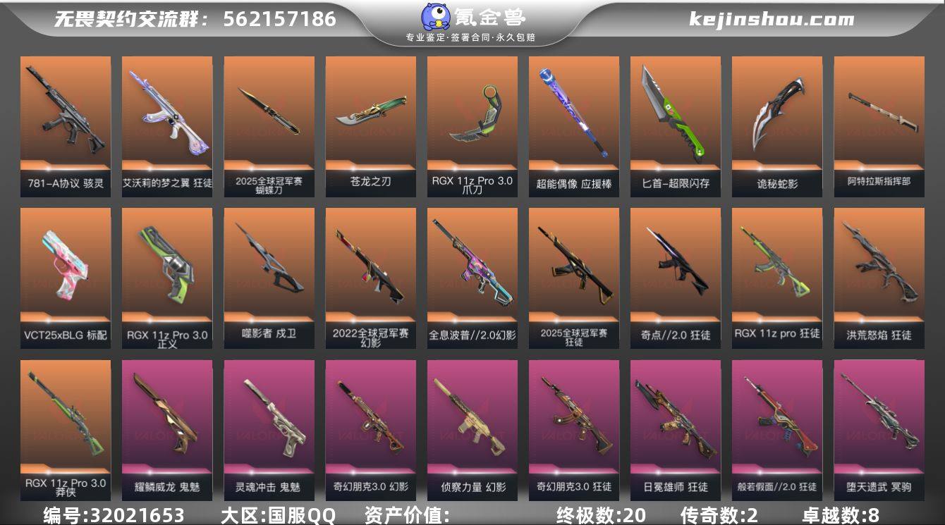 【套装】:2025全球冠军赛套装,RGX 11z Pro//3.0套装【英雄】:幻棱,炼狱,维斯,暮蝶,钛狐,壹决,铁臂,捷风,雷兹,幽影,不死鸟,贤者,猎枭,蝰蛇,零,芮娜,奇乐,尚勃勒,霓虹,斯凯,夜露,星礈,K/O,海神,盖可,黑梦,钢锁【近战武器】:近战武器-2025全球冠军赛 蝴蝶刀,近战武器-魔术火花,近战武器-5周年//公测重制版 苍龙之刃,近战武器-神之刃,近战武器-穿花蝴蝶,近战武器-RGX 11z Pro//3.0 爪刀,近战武器-超能偶像 应援棒,近战武器-超限闪存 匕首,近战武器-诡秘蛇影 军刀,近战武器-阿特拉斯指挥部 甩棍,近战武器-魔术火花【狂徒】:狂徒-艾沃莉的梦之翼,狂徒-2025全球冠军赛,狂徒-洪荒怒焰,狂徒-奇点//2.0,狂徒-RGX 11z Pro,狂徒-般若假面//2.0,狂徒-日冕雄师,狂徒-奇幻朋克//3.0,狂徒-超能偶像,狂徒-诡秘蛇影【幻影】:幻影-2022全球冠军赛,幻影-全息波普//2.0,幻影-侦察力量,幻影-奇幻朋克//3.0,幻影-超限闪存,幻影-聚合之力,幻影-末日之翼【戍卫】:戍卫-噬影者,戍卫-超能偶像,戍卫-浮光跃金,戍卫-折光棱晶【獠犬】:獠犬-采蜜小蜂队,獠犬-模拟赫兹【冥驹】:冥驹-堕天遗武,冥驹-模拟赫兹【飞将】:飞将-聚合之力,飞将-末日之翼【莽侠】:莽侠-RGX 11z Pro//3.0,莽侠-超限闪存,莽侠-诡秘蛇影【战神】:战神-采蜜小蜂队,战神-浮光跃金【奥丁】:奥丁-末日之翼【判官】:判官-超能偶像,判官-诡秘蛇影,判官-采蜜小蜂队【雄鹿】:雄鹿-模拟赫兹【骇灵】:骇灵-781-A协议,骇灵-浮光跃金【蜂刺】:蜂刺-超限闪存,蜂刺-聚合之力,蜂刺-折光棱晶【标配】:标配-超能偶像,标配-浮光跃金,标配-折光棱晶【VCT手枪】:标配-VCT25 x BLG【正义】:正义-RGX 11z Pro//3.0,正义-超限闪存,正义-纳米打击【鬼魅】:鬼魅-灵魂冲击,鬼魅-耀鳞威龙,鬼魅-诡秘蛇影,...