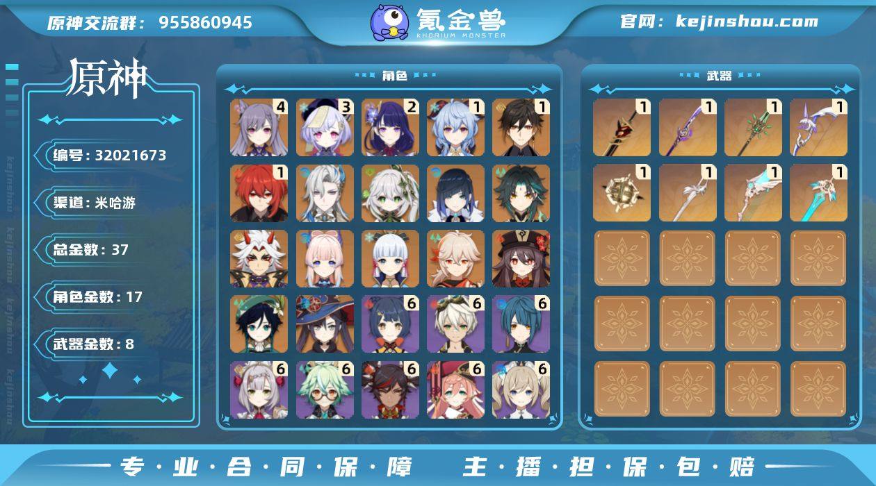 邮箱: 送网易邮箱 总黄数: 37 冒险等级: 58 4命金色角色: 四命刻晴 3命金色角色: 三命七七 2命金色角色: 二命雷电将军 1命金色角色: 一命迪卢克,一命钟离,一命甘雨 0命金色角色: 温迪,枫原万叶,神里绫华,莫娜,魈,胡桃,珊瑚宫心海,荒泷一斗,夜兰,纳西妲,那维莱特 拥有武器: 天空之翼,和璞鸢,阿莫斯之弓,风鹰剑,天空之刃,尘世之锁,薙草之稻光,赤角石溃杵 1精武器: 天空之翼,和璞鸢,阿莫斯之弓,风鹰剑,天空之刃,尘世之锁,薙草之稻光,赤角石溃杵 亮点: S-YH9065纳西妲,温迪,枫原万叶,魈,胡桃,神里绫华,珊瑚宫心海,莫娜,荒泷一斗,夜兰,那维莱特,钟离,甘雨,迪卢克,雷电将军,七七,刻晴,班尼特,辛焱,砂糖,诺艾尔,香菱,罗莎莉亚,芭芭拉,迪奥娜,行秋,菲谢尔,凝光,云堇,托马,早柚,九条裟罗,烟绯,薙草之稻光,天空之翼,尘世之锁,天空之刃,风鹰剑,阿莫斯之弓,和璞鸢,赤角石溃杵,