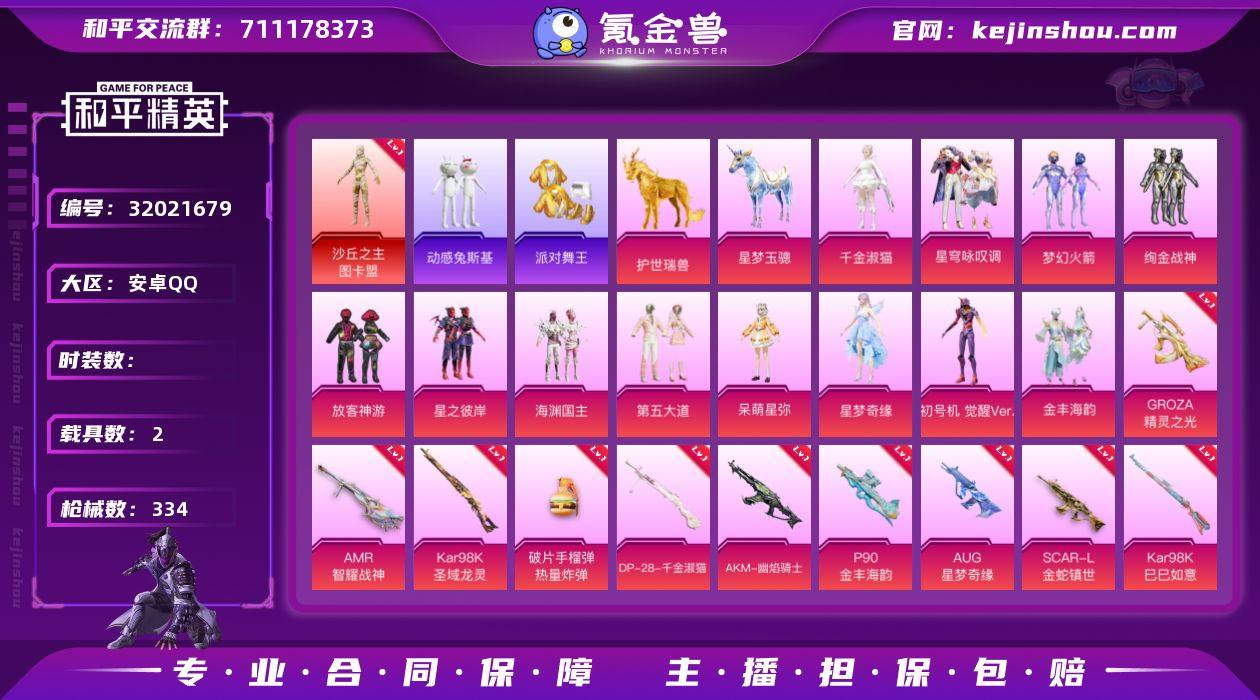 艾丽娅 发光眼罩 金鞋 7级星梦奇缘AUG 6把计数枪】c26595-【可二次】【因赛季更新游戏段付以上号为准!】 安卓Q-2红装3稀有2载具13粉装24特效枪15热门213套装334枪皮 13印记 历史无敌战神 【2红装】 暮色玫影-艾丽娅 (1级) 沙丘之主-图卡盟 (4级) 【3稀有】 浪漫天命 派对舞王 派对舞王(金靴子) 【2载具】 护世瑞兽 星梦玉骢 【13粉装】 觉醒初号机 梦幻火箭 千金淑猫 金丰海韵 异瞳寒姬 星穹咏叹调 星梦奇缘 呆萌星弥 放客神游 第五大道 绚金战神 星之彼岸 海渊国主 【23特效枪】 SCAR-L-金蛇镇世 (3级) SCAR-L-锦绣绵绵 (5级) M416-天马神君 (2级) M416-电玩时刻 (5级) P90-金丰海韵 (7级) AKM-幽焰骑士 (3级) AKS-74U-森灵之息 (4级) AKM-绿萝繁花 (5级) Kar98K-圣域龙灵 (3级) Kar98K-巳巳如意 (5级) DP-28-千金淑猫 (2级) DP-28-豹影疾电 (5级) AUG-星梦奇缘 (7级) Mk14-精灵梦叶罗丽 (5级) AMR-智耀战神 (4级) GROZA-精灵之光 (3级) MG3-洛神天依 (3级) Mk14-福马献瑞 (5级) AA12-G-萌骑幻想 (4级) ACE32-萌骑漫游 (1级) Vector-环太平洋 (4级) 燃烧瓶-薄荷可可 (3级) 破片手榴弹-热量炸弹 (7级) 【15热门】 8号机 Mark.06 龟仙人 浪漫假日 雪山精英 动感兔斯基 晶辉守护 鹰眼刺客 TJB追光队服 TJB战队服 暗影哥特 狂沙舞者 漫步者 破蛋小黄鸡 军刀雅典娜 【7飞行器】 龙翔九天飞行器 齐天大圣飞行器 深渊漩涡飞行器 镜光幻境飞行翼 萌物绒绒飞行器 千面幻镜飞行器 星夜魔法师飞行翼 【2头盔】 梦幻火箭头盔 甜心宝贝头盔