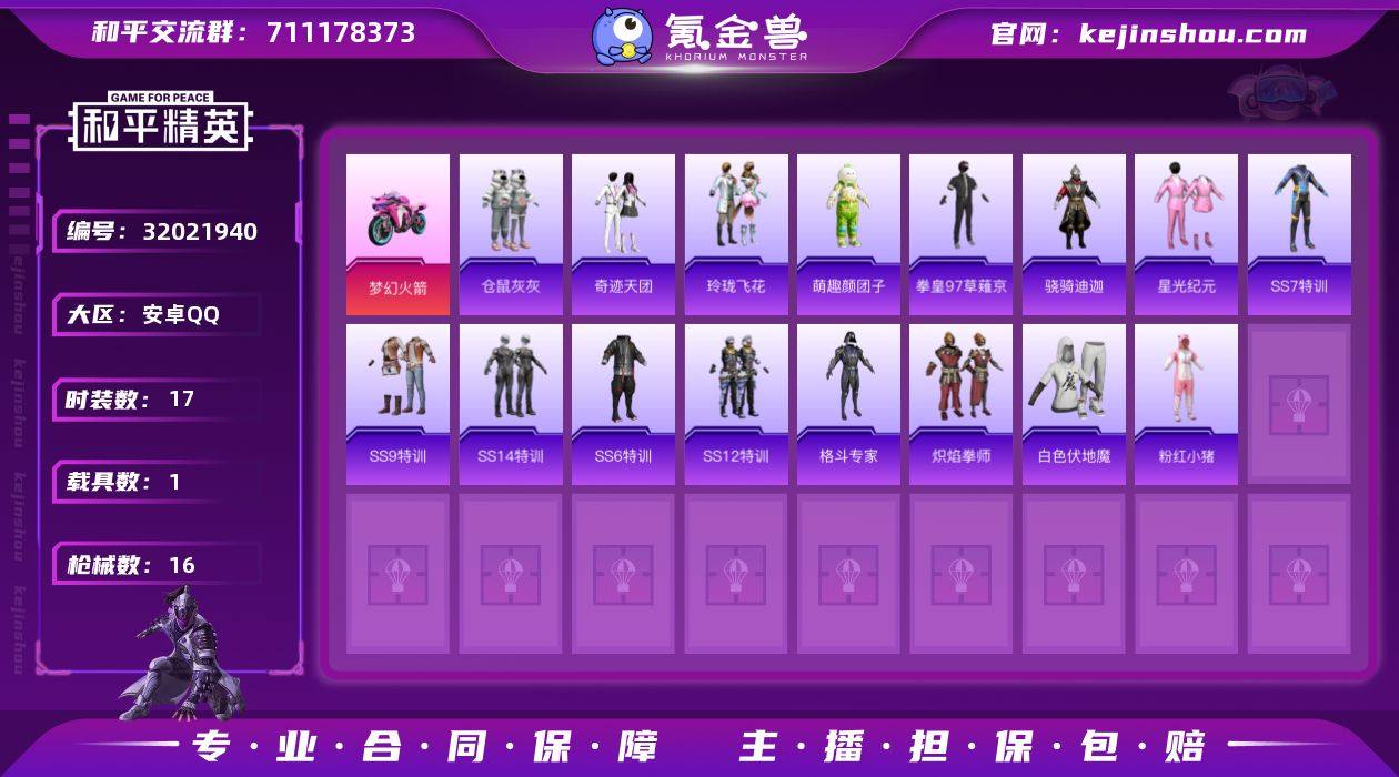 【和平精英】1粉装,0特效枪,1载具,历史最高段位:坚韧铂金Ⅱ 热力值:14606,29套装,44枪械,48装备,20战备;套装:套装-梦幻火箭,套装-白色伏地魔,套装-骑行爱好者,套装-竞技勇士朋克,套装-六六大吉,套装-战地菁英,套装-坚韧舞者,套装-传奇侦探,套装-青涩时光,套装-格斗先锋,套装-粉红小猪,套装-北国孤狼,套装-SS6特训,套装-拳皇97草薙京,套装-炽焰拳师,套装-格斗专家,套装-星光纪元,套装-奇迹天团,套装-仓鼠灰灰,套装-玲珑飞花,套装-跃动心情,套装-SS7特训,套装-霓虹街区,套装-SS9特训,套装-探宝勇士,套装-骁骑迪迦,套装-萌趣颜团子,套装-SS12特训,套装-SS14特训;枪皮:AKM-灼热熔岩,AKM-玉龙,AKM-破晓战魂,AKM-夜灯,AKM-萌趣颜团子,AKM-乌木金纹,SCAR-L-红色方程式,SCAR-L-炫彩节奏,SCAR-L-乌木金纹,M416-夜灯,M416-绯红前夜,M416-仓鼠灰灰,M416-乌木金纹,AUG-耀粉歌者,M762-拳皇97,M762-烈焰拳霸,M762-乌木金纹,M16A4-红色方程式,GROZA-春暖花开,GROZA-乌木金纹,QBZ-乌木金纹,Kar98K-红色方程式,Kar98K-梦幻火箭,Mini14-梦幻火箭,VSS-乌木金纹,Vector-彩虹符号,Vector-乌木金纹,汤姆逊-耀粉歌者,汤姆逊-乌木金纹,UZI-红色方程式,UMP45-夜灯,UMP45-蓝色火焰,UMP45-生命誓言,UMP45-乌木金纹,S1897-神秘黑猫,S686-深海曼妙,S686-乌木金纹,S12K-乌木金纹,M249-拳皇97,M249-乌木金纹,DP-28-乌木金纹,P92-拳皇97,撬棍-传奇侦探,平底锅-拳皇97;载具:双人摩托-梦幻火箭;降落伞:梦幻火箭飞行器,拳皇97滑翔尾迹; 详情看图1粉装1载具 梦幻火箭 摩托