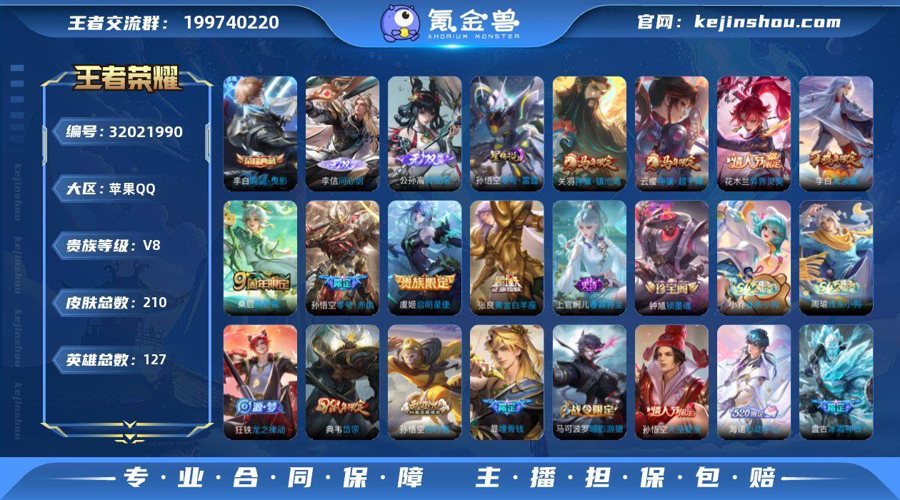 【秒换绑】苹果Q-V8-至尊星耀I段位-127英雄-210皮肤-1典藏皮肤-2无双-9传说-63史诗 【英雄全皮】:孙权全皮,敖隐全皮 【荣耀典藏】:李白鸣剑曳影 【无双皮肤】:公孙离离恨烟,李信问心剑 【传说皮肤】:韩信踏浪归,云缨神骥越千峰,关羽神骥镇沧海,花木兰异界灵契,桑启鸣野蒿,虞姬启明星使,孙悟空零号赤焰,张良黄金白羊座,李白凤求凰 【限定皮肤】:公孙离离恨烟,暃埋骨钱,狄仁杰阴阳师,赵云皇家上将,赵云龙胆,墨子神迹守卫,庄周云端筑梦师,庄周高山流水,高渐离死亡摇滚,高渐离玩趣恶龙,阿轲迷踪丽影,钟无艳超时空战士,芈月幻夜卜梦,元歌云间偶戏,元歌无心,夏侯惇朔风刀,甄姬落雪兰心,典韦岱宗,马可波罗暗影游猎,狄仁杰魔术师,狄仁杰万华元夜,达摩沙漠行僧,项羽海滩派对,老夫子醍醐杖,老夫子航海奇遇记,程咬金演武夺筹,刘邦夺宝奇兵,韩信飞衡,兰陵王金庭之子,花木兰默契交锋,亚瑟潮玩骑士王,孙悟空大圣娶亲,孙悟空零号赤焰,孙悟空孙行者,牛魔御旌,后羿圣弓游侠,李元芳银河之约,李元芳云中旅人,虞姬启明星使,钟馗驱傩正仪,杨玉环遇见飞天,干将莫邪真爱魔法,雅典娜单词大作战,雅典娜黎明之约,蔡文姬繁星吟游,太乙真人华丽摇滚,鬼谷子原初探秘者,鬼谷子五谷丰年,黄忠火炮绅士,苏烈千军破阵,百里玄策原初追逐者,弈星混沌棋,梦奇顽趣,沈梦溪星空之诺,沈梦溪大漠名商,明世隐疑决卦,裴擒虎李小龙,裴擒虎擒涛扼浪,米莱狄御霄,云中君纤云弄巧,云中君时之祈愿,盾山御銮,猪八戒西部大镖客,上官婉儿梁祝,嫦娥拒霜思,蒙犽狂想玩偶喵,盘古冰霜神祇,桑启海盐诗旅,鬼谷子天穹祈灯,海诺心动手记 【年限皮肤】:李白凤求凰,典韦岱宗,韩信飞衡 【赛季限定】:米莱狄御霄,牛魔御旌,盾山御銮,夏侯惇朔风刀,弈星混沌棋,明世隐疑决卦,老夫子醍醐...