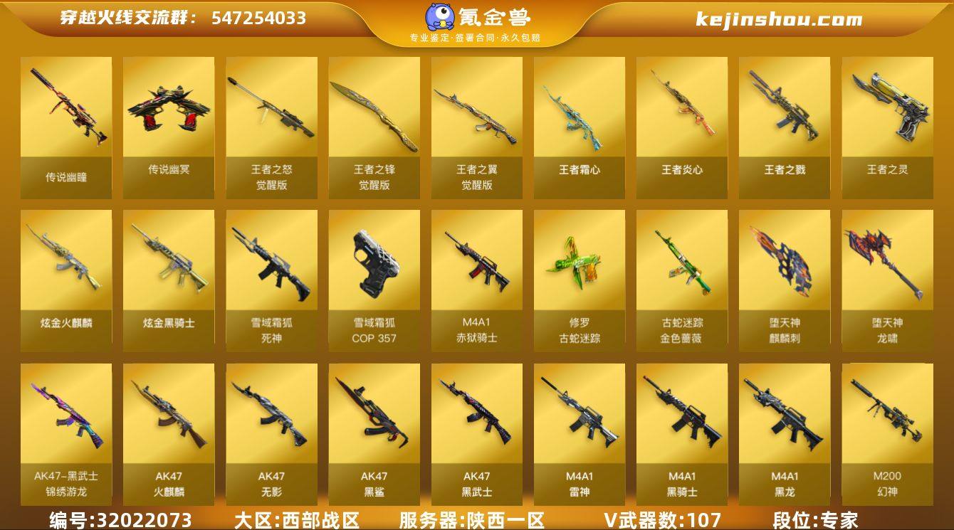 陕西一区-117V-8王者武器数-3炫金武器数 【传说武器】:传说幽瞳,传说幽冥 【热门武器】:传说幽瞳,传说幽冥,QBZ03-金色蔷薇,Scar Light-白虎,HK417-朱雀,M4A1-青龙,M200-幻神,金色蔷薇-古蛇迷踪,修罗-古蛇迷踪,死亡之眼,荣耀世冠-雷神,荣耀世冠-柯尔特,王者炎心,Kar98K-星神,C.A.T,毒蜂,M4A1-黑骑士,汤姆逊-烈龙*6,RPK-盘龙*4,加特林-炼狱*2,幻神-枪娘爱丽丝,火麒麟-绝迹,沙鹰-修罗*5,柯尔特-赛博朋克,炽芒蝶刃*2,炽芒蝶刃-破浪逐光 皮肤,荣耀世冠-龙啸 【王者炫金武器】:王者炎心,王者之戮,王者霜心,王者之灵,炫金火麒麟*2,炫金骑士 【音效卡】:M200-幻神音效卡*2,M4A1-雷神音效卡,M4A1-黑骑士音效卡,Barrett-毁灭音效卡,Barrett-极光音效卡,Scar Light-白虎音效卡,枪娘语音包-阿敏,枪娘语音包-凯萨林,Kar98K-星神音效卡,死神-雪域霜狐-怀旧音效卡 【皮肤】:幻神-Heartshot 皮肤,幻神-曹操 皮肤,白虎-白鲨-CFPLS23冠军,QBZ03-AG-CFPLS19冠军,裁决-巅峰荣耀 皮肤,星神-枪娘默 皮肤,烈龙-星空,雷神-星空,雷神-虎将,雷神-耀金皮肤,雷神-传奇N9,雷神-R.LGD-CFPLS18冠军,雷神-仲达白露 皮肤,火麒麟-轻羽皮肤,火麒麟-平天大圣,毁灭耀金皮肤,毁灭-星空,毁灭-星耀 皮肤,毁灭-定军扬威 皮肤,黑龙-能量核心,M4A1-黑龙-361,黑骑士-破界 皮肤,无影耀金皮肤,无影-霓裳皮肤,AK47-黑武士-361,战神-粉色甜心皮肤*4,战神-紫绶金章皮肤*6,战神-流金岁月皮肤*7,天龙-能量核心,AWM-天龙-传奇白鲨,AWM-再燃火线,极光-能量核心,炼狱-星空,屠龙-春桃 皮肤,屠龙-破浪逐光 皮肤,炽芒蝶刃-破浪逐光 皮肤 【角色】:葵,樱,迷迭香,电竞教官-云悠悠,枪娘樱,岚兮儿,审判者,王者-零,雪域霜狐,蛇隐宗,奇洋探员,初恋灵狐,芳心审判者,飞虎队-X,虎妞...