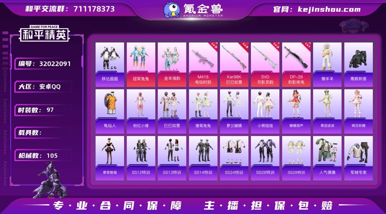 安卓 手Q-2粉装-4特效枪-0载具-1粉色飞行器-33073热力值-4王牌印记-97套装-105枪皮 【热门品类】:套装-胖达圆圆,套装-龟仙人,套装-粉红小猪 【粉色套装】:粉装-冠军兔兔,粉装-金丰海韵 【粉色枪皮等级】:M416-电玩时刻(五级),Kar98K-巳巳如意(五级),SVD-月影灵韵(三级),DP-28-豹影疾电(一级) 【粉色枪皮】:M416-电玩时刻,Kar98K-巳巳如意,SVD-月影灵韵,DP-28-豹影疾电 【粉色飞行器】:冠军兔兔飞行器 【粉色降落伞】:精灵梦叶罗丽降落伞,冠军兔兔降落伞,守护天翼降落伞,千金淑猫降落伞 【稀有套装】:套装-龟仙人,套装-巳巳如意,套装-雏菊兔兔,套装-萝兰蝴蝶,套装-小熊娃娃,套装-糖糖葫芦,套装-青团波波,套装-棉花软糖,角色-摩登魅猫,玩偶服-懒羊羊 【稀有枪皮】:AKM-夜灯,AKM-破晓战魂,SCAR-L-夜灯,SCAR-L-炫彩节奏,SCAR-L-粉锦千层,M416-红色方程式,M416-蓝色火焰,GROZA-懵萌河马,AUG-天降萌叽,AUG-耀粉歌者,QBZ-彩虹符号,M762-彩虹符号,M762-牛气冲天,M762-第五大道,G36C-懵萌河马,AC-VAL-天降萌叽,蜜獾-天降萌叽,UZI-天降萌叽,UZI-红色方程式,UMP45-涂山之恋,UMP45-蓝色火焰,Vector-彩虹符号,汤姆逊-耀粉歌者,MP5K-飒粉甜心,P90-巳巳如意,Kar98K-彩虹符号,Mini14-炫彩节奏,Mini14-耀粉歌者,莫辛纳甘-懵萌河马,S686-彩虹符号,S686-生命誓言,S686-千金淑猫,S12K-玩趣呆呆,S12K-破晓战魂,S12K-夜灯,S12K-幻世战舞者,DBS-彩虹符号,DBS-创世·救赎,M249-糯团青竹,MG3-幻世战舞者,MG3-第五大道,PKM-懵萌河马,蝎式手枪-千金淑猫 【其他套装】:套装-SS12特训,套装-SS13特训,套装-SS14特训,套装-SS24特训,套装-SS28特训,套装-SS29特训,套装-人气偶像,套装-军械专家,套装-完美偶像,套装-幻世战舞者,套装-幻影武者,套装-怒火燎原,套...