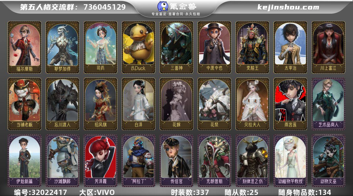 账号类型: 手机账号 时装数: 337 时装: 26号守卫-B.Duck,爱哭鬼-被时间遗忘的男孩,爱哭鬼-当铺老板,“慈善家”-传信官,厂长-永恒之王,厂长-“阿拉丁”,雕刻家-动物女巫,“噩梦”-随机数,古董商-白泽,红蝶-花嫁,红夫人-最后一舞,红夫人-贝拉夫人,画家-长生,画家-江户川乱步,“杰克”-白纹大触,“杰克”-斯文加利,“杰克”-忘川渡人,空军-新岛真,勘探员-鼹鼠先生,勘探员-中原中也,昆虫学者-动植物学教授,哭泣小丑-炮弹飞船,鹿头-阿努比斯,鹿头-刻律涅之伤,冒险家-考古教授,盲女-甜心蛋糕,盲女-海女巫,梦之女巫-川上富江,梦之女巫-羽蛇,梦之女巫-红龙夫人,破轮-三面神,“囚徒”-太宰治,入殓师-喜多川祐介,入殓师-守钟人,宿伞之魂-日月相随,守墓人-壁画修复员,调酒师-黑玫瑰,舞女-高卷杏,舞女-恶之花,小丑-变脸王,渔女-迷迭香,蜘蛛-花祭,杂技演员-雨宫莲,“囚徒”-天海兰太郎,幸运儿-星航之旅,黄衣之主-克朗普斯,古董商-招风旗,渔女-破魔之刃,教授-紧急运输,击球手-钨,邮差-报纸怪客,“法罗女士”-芳泽霞,破轮-沙滩漂移,小说家-“伊始新篇”,医生-司药,孽蜥-耶梦加得,骑士-艺术品商人,小说家-福尔摩斯