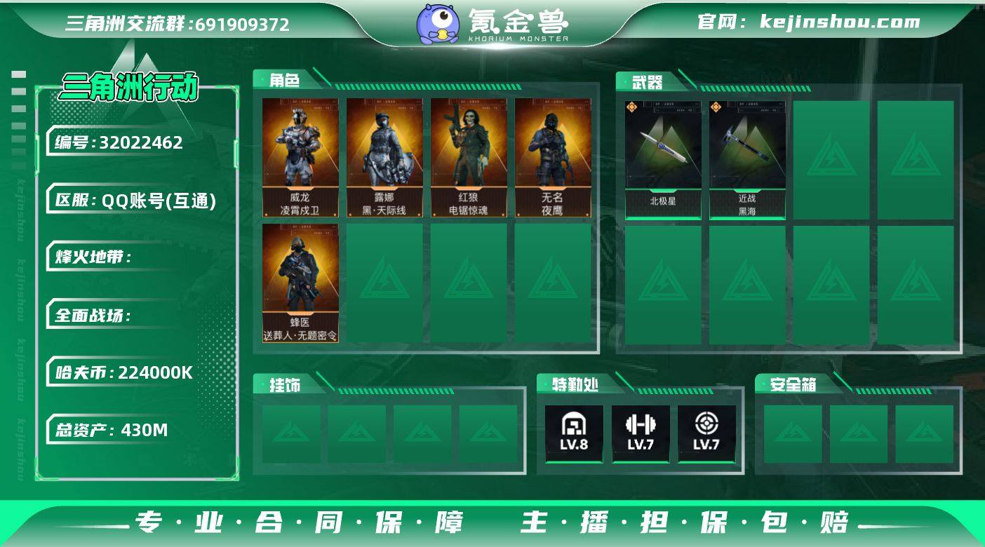 S1333总资产430M,哈夫币22400w,近战3 枪皮数量234,威龙-凌霄戍卫/露娜-黑天际线/红狼-电锯惊魂/无名-夜鹰/蜂医-送葬人无题密令,近战-北极星/近战-黑海,战场等级44上等兵, 行动等级60钻石,安全箱等时效性道具请以游戏内数据为准,详情请看图
