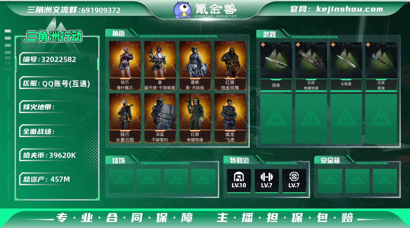 S1335 总资产457M,哈夫币3962w,近战5 枪皮数量298,骇爪-维什戴尔/露娜-黑天际线/红狼-蚀金玫瑰/骇爪-水墨云图/蛊-能天使午夜邮差/红狼-电锯惊魂/深蓝-不破誓约/无名-夜鹰/威龙-飞虎/蜂医-送葬人无题密令,近战-信条/近战-北极星/近战-黑海/近战-电锯惊魂,战场等级50上等兵, 行动等级60铂金,安全箱等时效性道具请以游戏内数据为准,详情请看图