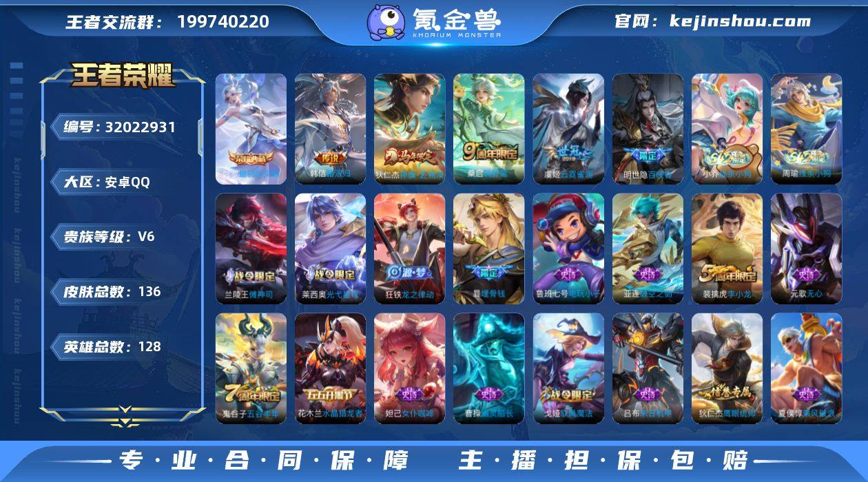 【WZYH923】贵族6/皮肤136/典藏1/传说4/史诗40/英雄128/孙权全皮/敖隐全皮/最初的交响/韩信踏浪归/狄仁杰神骥赴朔漠/鸣野蒿/云霓雀翎/埋骨钱/蒙犽顽岩魄/蔡文姬夏日便利店/虞姬夏日便利店/天穹之誓(s36)/阴阳师/皇家上将/优雅恋人/蔷薇恋人/无心/落雪兰心/魔术师/海滩派对/醍醐杖(s20)/银河之约/云中旅人(s29)/原初探秘者(s21)/五谷丰年/混沌棋(s18)/大漠名商(s28)/疑决卦(s19)/李小龙/擒涛扼浪(s31)/梁祝/玲珑珍味/探海日志(s32)/海盐诗旅(s30)/驭风魔法/江河有灵/古海寻踪(s33)/百解令(蒙犽)/鬼谷子天穹祈灯(S34)/龙武盛年/剑破天穹(s35)/熔金海岸/噬灭天穹(s37)/虚灵犬护/逆浪荇歌/荣光之誓/破空之剑/神迹守卫/傩神司/光弋星穹/往忆晖光/线条小狗-周瑜/线条小狗-小乔/明世隐百晓客/龙之律动/鹰眼统帅/箭羽风息/节奏热浪/功夫厨神/特工魅影/黄金分割率/暗隐猎兽者/乘风破浪/水晶猎龙者/末日机甲-吕布/幽灵船长/圣诞狂欢/金属风暴/女仆咖啡/水果甜心/鬼剑武藏/偶像歌手/未来纪元-赵云/电玩小子/兰陵王雾影缉谜/班班快跑/线条小狗-桑启/苍云破阵/溯影追猎/径山谋武/克喵/布丁狗之约/星梦巡礼/雪境奇遇-西施/敬我三分/经纬探寻者/功夫炙烤/聚星闪耀/妄想特派/劲辣红锅/潮玩探月行/蔚蓝守将/胡桃狂想曲/无双福将/乓乓大师/秘密基地/圆桌骑士(盾山)/次元突破/鲨炮海盗猫/虹云星官/坚韧之力/幻乐之宴/敏锐之力/掌控之力/沉稳之力/功夫老勺/海滩丽影/汉昭烈帝/阿尔法小队/万象初新/万事如意/花好人间/拳王/死亡骑士/黄金武士/时尚教父/玩偶对对碰/白色死神/红桃皇后/大发明家/爱心护理/哥特玫瑰/街头霸王/教廷特使/前尘/孤猎/创世神祝/街头旋风/美梦成真/爱与和平/伊势巫女/加勒比小姐/精灵王/万圣前夜/潮流仙人/异域舞娘/木偶奇遇记