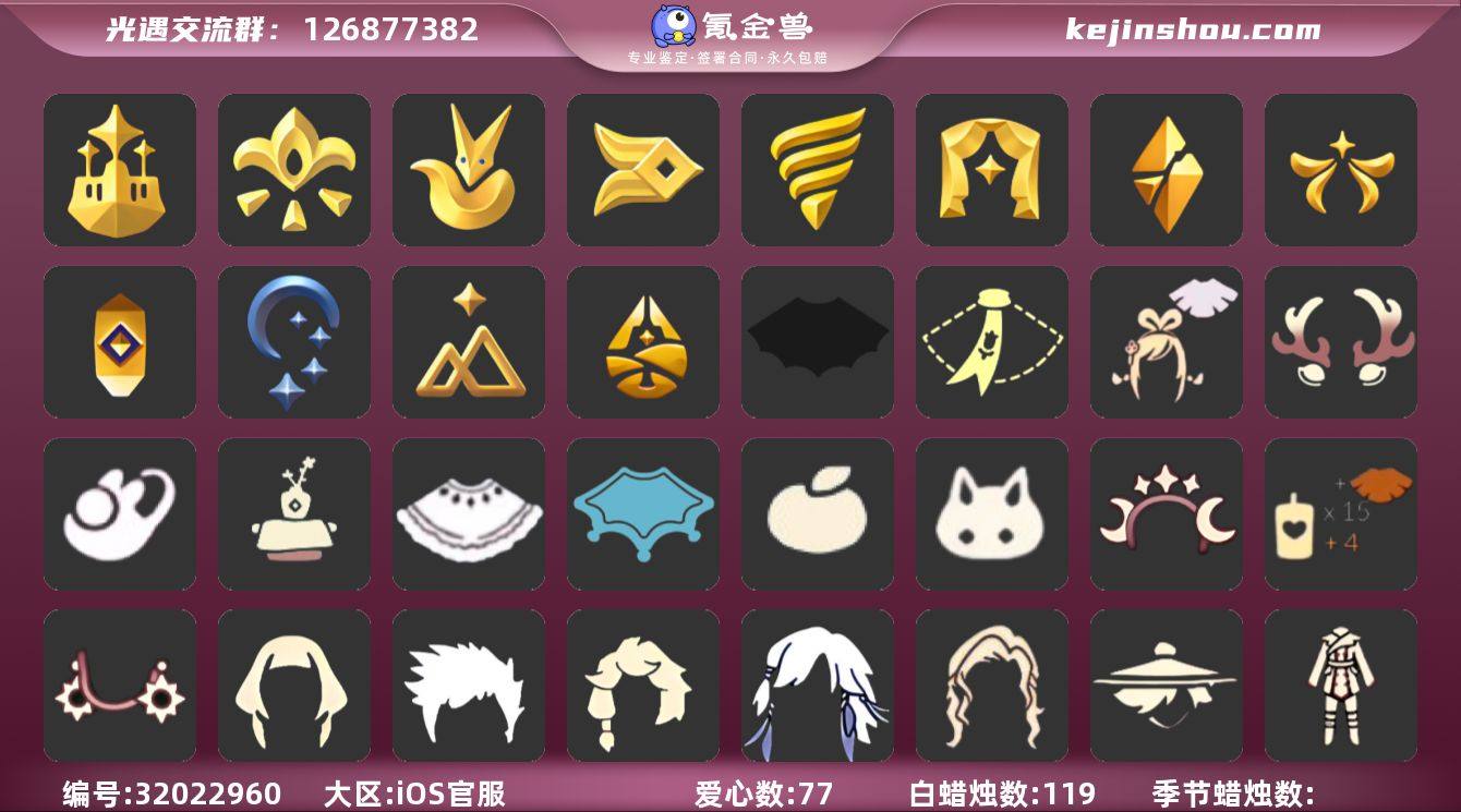 [17307820]iOS官服 手机账号 2珍稀物品 10毕业季 4毕业图 1847蜡烛 【珍稀物品】周年电吉他,彩虹围巾(五塑彩带斗) 【季节已毕业】青鸟季,双星季,夜行季,拾光季,归巢季,九色鹿(九色鹿季),筑巢季,二重奏季,姆明季,彩染季 【完成地图】云野,雨林,霞谷,墓土(暮土) 【礼包】青衫落拓礼包,海牛玩偶礼包,兔子鞋(兔子拖鞋),史力奇套装,新年裤(瑞气服饰),蝴蝶结(大蝴蝶结),水母(水母肩饰),向日葵套(夏日有友礼包),海蓝波浪发型(海洋发型),巫师(巫师帽),橘子(大橘大利),贝壳(贝壳发饰),兔子(玉兔头饰)(玉兔发饰)(兔子发饰),大耳狗发饰(迷你大耳狗发饰),心心相印发饰礼包,四叶草(四叶草头饰),九色鹿角(神鹿祝福头饰)(神鹿祝福礼包),新年耳钉(金鳞耳饰),彩虹耳钉(彩虹耳饰),枯角(巫树犄角),鹿角(圣诞鹿角),围巾(小王子斗篷)(小王子围巾),欧若拉之翼,福娃(福娃礼包)(春之日礼包)(铜钱斗),透明蛛丝(透明蜘蛛斗),电吉他(周年电吉他),荷叶伞,献瑞折扇礼包,茶桌(花憩茶桌),茶壶(小憩茶桌),小狐狸(狐狸背包),猫背饰(猫咪背饰),大铁头 【裤子】筑巢季·裤子(设计师长袍),妮妮裙子(妮妮长裙),武士裤,背带裤,搓澡巾,击剑裤 【面具】夜行毕业面具(棕熊面具),辉光羚羊面具 【面饰】黑框眼镜(粗框眼镜),青鸟毕业面饰(青鸟面饰),红耳机 【发型】飞天盘发(九色鹿丸子头),虚荣,归巢毕业发型(五塑彩羽发),若笠(箬笠) 【头饰】平顶帽,蓝色音乐会(蓝色音乐符),牛仔帽(西部帽) 【斗篷】粉红绒毛斗篷(绒毛斗篷),青鸟毕业斗篷(青鸟斗篷),彩染围巾斗篷,绿芽,海洋斗 【配饰】相机(季卡相机),小红伞(姆明红伞)(姆明大伞),姆明抱枕,雨伞,筑巢季·小手办(光之子试衣),高音钢琴(白色高脚钢琴)