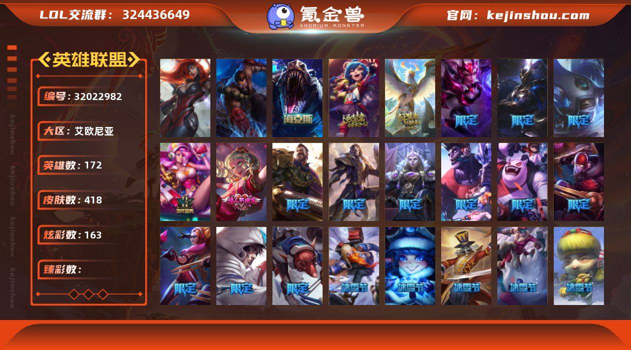 WL542【电信艾欧尼亚 2终极 6神话 4王者 3典藏 7臻彩】172英雄-418皮肤-163炫彩-段位:铂金 【终极】武装战姬厄运小姐 灵魂守卫乌迪尔【神话】十五周年纪念希维尔 至臻神龙尊者均衡之龙沃利贝尔 源代码乐芙兰 十周年纪念安妮 神凰行者瑞羽圣凰艾尼维亚 海克斯科技雷克顿【王者】星空之门内瑟斯 死亡骑士内瑟斯 西部牛仔崔斯特 五杀摇滚鼓手奥拉夫【典藏】宗师级锻造训练师波比 法老阿木木 钢铁终结者塞恩【臻彩】冠军之影劫凯旋圣装 天龙之子卡莎飞龙乘云 魔女阿卡丽虚荣 净雪之月莫甘娜冬虹 神龙尊者圣龙李青登龙 可爱可爱粉红红布里茨 无畏骑士瑟庄妮赤子初心【皮肤】灵魂守卫 武装战姬 至臻神龙尊者均衡之龙 沃利贝尔 创星之灵璐璐 都铎王朝老鼠 勇者阿狸 穿星魔锋赵信 海克斯雷克顿 福牛守护者佛耶戈 龙年盲僧 羊年金克丝 10周年安妮 10周年神凰行者瑞羽圣凰艾尼维亚 3周年女枪 甜心宝贝安妮 寒冬精灵璐璐 冰雪节炼金 胡桃夹子小丑 魄罗骑士瑟庄妮 圣诞开心鬼提莫 圣诞精灵崔丝塔娜 圣诞狂欢努努 圣诞老人酒桶 圣诞糖果棒女枪 圣诞玩偶波比 胜利枪神格雷福斯 胜利之剑剑魔 胜利枪神卢锡安 胜利女神瑟庄妮 S2暗杀星蒙多 S2暗杀星努努 S3SKTT1劫 S3SKTT1婕拉 S4SSW泰隆 S4SSW老鼠 S7SSG洛 地狱行者孙悟空 鬼影重重魔腾 灵魂收割者奶妈 钢铁军团盖伦 陆地王者4WD布里茨 灵魂莲华瑟提 神王盖伦 幻灵战斗队长女枪 源计划:联合艾希 西部天使艾希 奥德赛凯隐 恶魔之刃蛮王 黎明使者锐雯 黑夜使者亚索 地狱之门卫士加里奥 魔幻卡牌崔斯特 暗星尊烬 黯黑魔龙希瓦娜 冰霜亚龙希瓦娜 战地机甲厄加特 神拳李青 星之守护者金克丝 战地巨兽科加斯 西部魔影卢锡安 银河魔装机神兰博 天煞劫 黯晶凤凰艾尼维亚 第三类接触黑默丁格 大天使长米迦勒凯尔 战场女武神凯尔 炼狱魔犬内瑟斯 源计划剑圣 电玩女神娑娜 恶魔男爵瑞兹 女主...