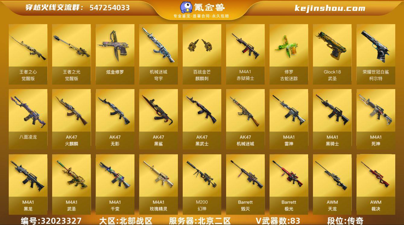 北京二区-88V-2王者武器数-1炫金武器数 【热门武器】:QBZ03-金色蔷薇,M200-幻神,柯尔特-荣耀世冠白鲨2023,修罗-古蛇迷踪,八面凌龙,死亡之眼,金色小号,M4A1-黑骑士,汤姆逊-烈龙*6,加特林-炼狱,沙鹰-修罗*5 【王者炫金武器】:炫金修罗 【音效卡】:Barrett-毁灭音效卡 【皮肤】:幻神-电流骇客 皮肤,雷神-暗月,雷神-能量核心*2,雷神-星空,M4A1-再燃火线,毁灭-暗月,毁灭-荣耀之怒,毁灭耀金皮肤*2,毁灭-星空,毁灭-英雄计划 皮肤,黑龙-能量核心,黑龙-暗月,黑骑士-暗月,黑骑士耀金皮肤,无影-能量核心,天启-暗月*2,八面凌龙-森林领主 皮肤,天龙-秘银,天龙-能量核心,极光-能量核心,修罗-能量核心,天神-暗月*2,屠龙-春桃 皮肤,轻型军用手斧-再燃火线 【角色】:葵,樱,炫,王者复仇,蛇隐宗,乔伊教练,修道士,云海玲珑,葵-阿尔法武装,初恋灵狐,飞虎队-X,娟娟,麻雀,曼陀罗-X,潘多拉-X,蛇姬,铁骑荣耀,兔囡囡,影武者-X 【人偶武器】:M37-葵,COP-旗袍,生化手雷-机甲核心,灵狐娃娃手雷 【暴走生化】:死亡之眼,超级对讲机 【挑战大师】:激光毁灭者III 【英雄级武器】:M4A1-千变,AK47-火麒麟,M4A1-黑龙*2,M4A1-雷神,M4A1-黑骑士,AK47-无影,M4A1-死神,AK47-黑武士,AK12-天启,AN94-超新星,M4A1-武圣,AK47-机械迷城,AK47-黑鲨,八面凌龙,M4A1-玫瑰精灵,QBZ03-金色蔷薇,9A91-烈火,王者之心-觉醒版,机械迷城-穹宇,AWM-天龙*5,Barrett-毁灭*4,Barrett-极光*2,AWM-裁决,M200-幻神,王者之光-觉醒版,加特林-炼狱,汤姆逊-烈龙*6,沙鹰-修罗*5,沙鹰-天神,COP-雷霆,柯尔特-荣耀世冠白鲨2023,Glock18-武圣,修罗-古蛇迷踪,屠龙*2,龙啸*2,擎天*2,麒麟刺*2,麒麟刺-百战金芒,高爆手雷-雷霆*5,高爆手雷-竞技荣光*2,高爆手雷-古蛇迷踪,闪光弹-雷霆*...