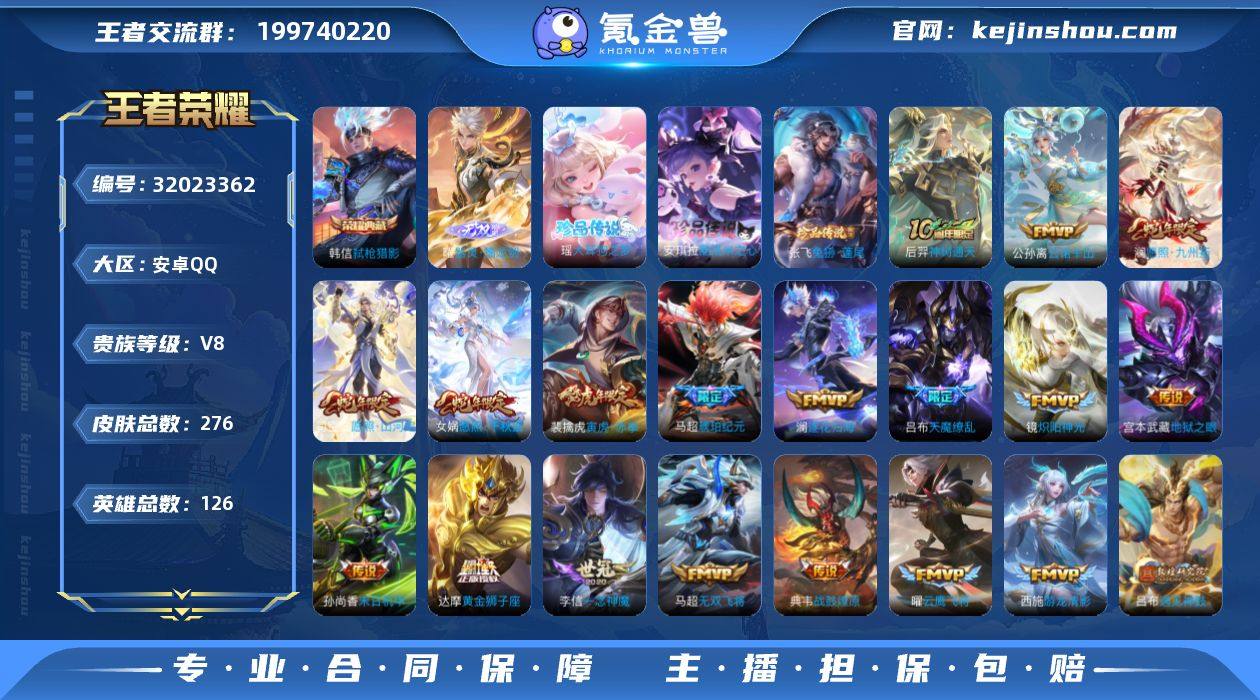 安卓Q-V8-最强王者段位-126英雄-276皮肤-1典藏-0珍品无双-1无双-3珍品传说-36传说-69史诗 【英雄全皮】:马超全皮,蒙恬全皮,司空震全皮,空空儿全皮 【荣耀典藏】:韩信弑枪猎影 【无双皮肤】:曜器灵螭龙剑 【珍品传说】:张飞兔狲蓬尾,瑶大耳狗之梦,安琪拉酷洛米之心 【传说皮肤】:后羿神树通天,公孙离云诺千山,司空震愿照山河定,女娲愿照千秋盛,澜愿照九州拓,裴擒虎祥瑞亨通,桑启鸣野蒿,典韦战鼓燎原,马超琥珀纪元,澜逐花归海,吕布遇见神鼓,宫本武藏惊梅引,东皇太一灼幽烈阳,公孙离记忆之芯,吕布怒海麟威,百里守约碎云,马超无双飞将,露娜启示之音,孙策末日机甲,裴擒虎寅虎赤拳,赵云淬星耀世,王昭君乞巧织情,西施游龙清影,镜炽阳神光,虞姬启明星使,曜云鹰飞将,李信一念神魔,刘备时之恋人,张良黄金白羊座,达摩黄金狮子座,后羿黄金射手座,貂蝉仲夏夜之梦,孙尚香末日机甲,宫本武藏地狱之眼,吕布天魔缭乱,狄仁杰超时空战士 【限定皮肤】:蒙犽顽岩魄,蔡文姬夏日便利店,虞姬夏日便利店,姜子牙天穹之誓,杨戬破阵退雄兵,狄仁杰阴阳师,赵云皇家上将,庄周高山流水,高渐离玩趣恶龙,钟无艳超时空战士,吕布天魔缭乱,吕布遇见神鼓,典韦岱宗,狄仁杰魔术师,达摩沙漠行僧,项羽海滩派对,貂蝉逐梦之音,露娜启示之音,兰陵王金庭之子,花木兰默契交锋,孙悟空至尊宝,后羿如梦令,李元芳云中旅人,虞姬启明星使,太乙真人华丽摇滚,鬼谷子五谷丰年,苏烈千军破阵,百里玄策原初追逐者,百里守约朱雀志,公孙离蜜橘之夏,裴擒虎寅虎赤拳,上官婉儿梁祝,鲁班大师探海日志,桑启海盐诗旅,艾琳流音漫舞,司空震地狱燃心,阿古朵江河有灵,张良古海寻踪,蒙恬荣光圣徽,高渐离燃音魔法,妲己灵卜魔法,鬼谷子天穹祈灯,马超琥珀纪元,姬小满妄想食味,沈梦溪龙舞盛年,鲁班...