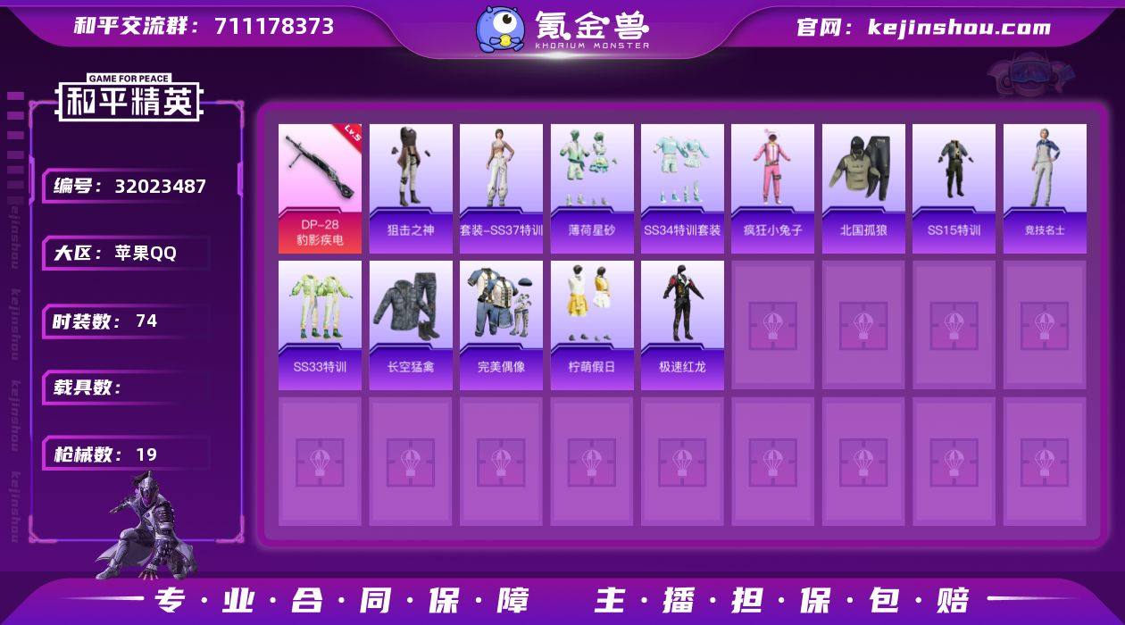 实名:可二次实名 是否支持人脸包赔:支持 特效枪数量:1 时装数:74 枪械数:19 五级DP-28-豹影疾电 狙击之神,SS37特训,薄荷星砂,SS34特训套装,北国孤狼,长空猛禽,疯狂小兔子,竞技名士,极速红龙,柠萌假日,SS15特训,SS33特训套装,完美偶像