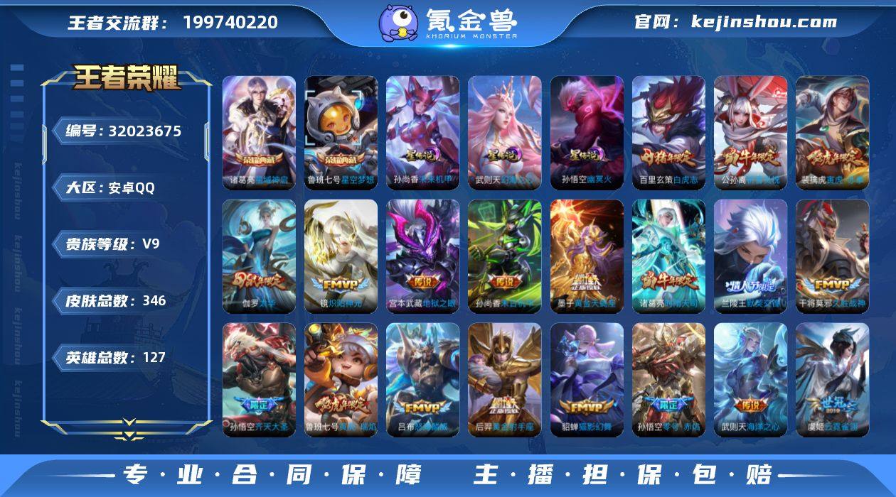 实名: 可修改 贵族等级: V9 英雄数: 127 皮肤数: 346 荣耀水晶: 武则天,星空梦想,星域神启 星传说: 幻海之心,未来机甲,幽冥火 传说皮: 黄金射手座,绛天战甲,猫影幻舞,久胜战神,炽阳神光,云霓雀翎,末日机甲-孙尚香,地狱火,零号·赤焰,海洋之心,地狱之眼,飞鸢探春,黄金天蝎座 限定皮: 冰锋战神,遇见飞天,李小龙,奔雷神使,祈雪灵祝,游园惊梦,梁祝,御风骁将,时雨天司,龙胆,白鹤梁神女,烈魂,辉光之辰,玄嵩,白晶晶,岱宗,天狼溯光者,神威,幽恒,时之彼端,飞衡,乒乒小将,太华,天狼狩猎者,冰霜恋舞曲,逐梦之星,寅虎·御盾,白虎志,青龙志,瑞麟志,玄武志,朱雀志,如梦令-嫦娥,至尊宝,默契交锋-兰陵王,一生所爱,如梦令-后羿,大圣娶亲,默契交锋-花木兰,寅虎·瑞焰,高山流水,孙行者,傲雪梅枪,寅虎·赤拳,时之祈愿-云中君,百木心枪,五谷丰年,怒海麟威,山海·碧波行,齐天大圣