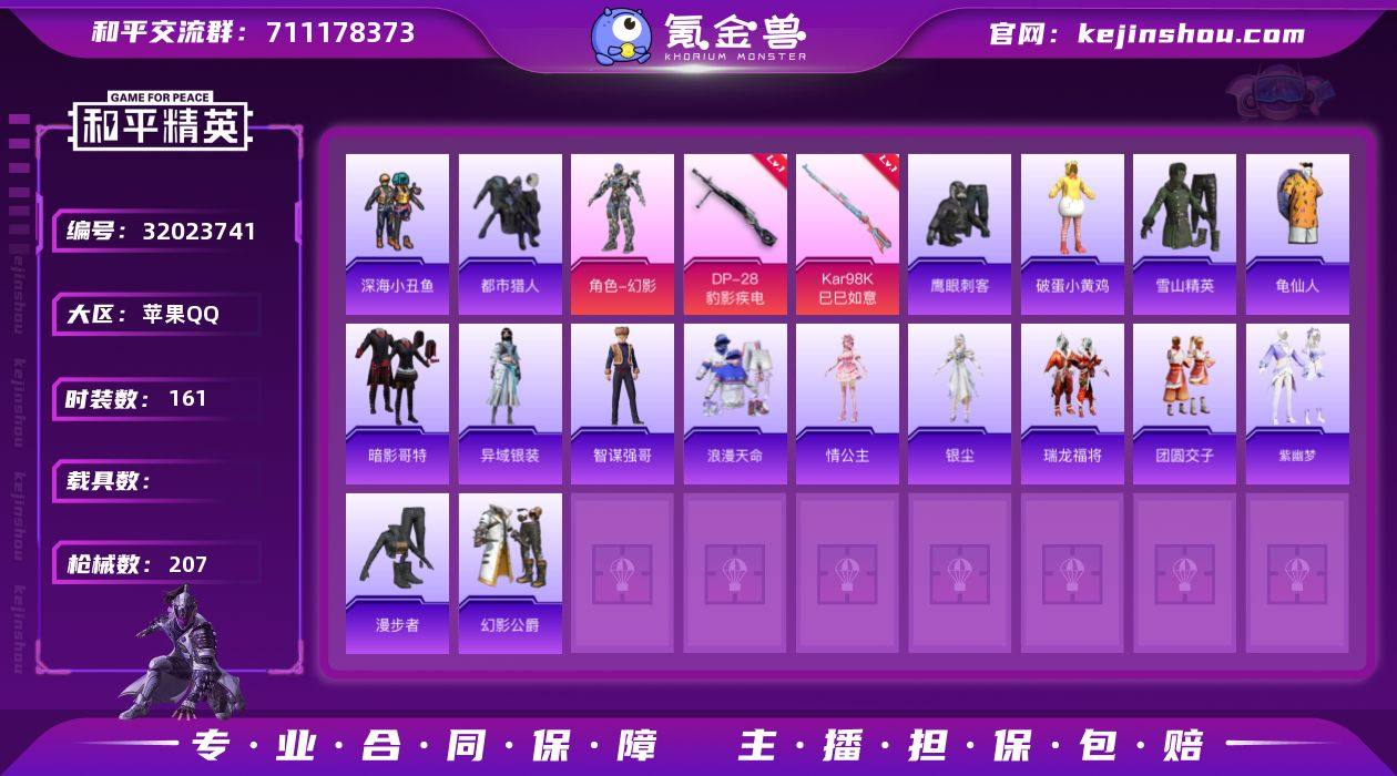 苹果 手Q-4粉装-4特效枪-1载具-0粉色飞行器-47350热力值-3王牌印记-97套装-159枪皮 【热门品类】:套装-浪漫天命,套装-奇异狩猎者,套装-金羽特工,套装-粉红小猪 【粉色载具】:鬼马风驰 【粉色套装】:粉装-扶摇飞仙,粉装-炙焰红王,粉装-蜜桃特工,粉装-仲夏莫吉托 【粉色枪皮等级】:SCAR-L-童趣迷兔(七级),Kar98K-巳巳如意(四级),SPAS-12-蜜语绒猫(四级),DP-28-豹影疾电(四级) 【粉色枪皮】:SCAR-L-童趣迷兔,Kar98K-巳巳如意,SPAS-12-蜜语绒猫,DP-28-豹影疾电 【粉色降落伞】:潮汐统领降落伞,阿狸红降落伞,海渊国主降落伞,旋转彩虹降落伞,绯穹魔姬降落伞 【稀有枪皮】:AKM-夜灯,AKM-彩虹符号,AKM-恐龙拽拽,AKM-灼热熔岩,AKM-破晓战魂,AKM-萌趣颜团子,AKM-虎虎生威,AKM-龙的传人,M16A4-幻世战舞者,M16A4-甜心亚梦,M16A4-红色方程式,M16A4-蓝色火焰,SCAR-L-炫彩节奏,SCAR-L-玉兔迎春,SCAR-L-红色方程式,SCAR-L-黄金龙骨,M416-暗星紫秘,M416-滑板小狐,M416-糯团青竹,M416-红色方程式,M416-蓝色火焰,GROZA-异彩先驱,GROZA-彩虹符号,GROZA-影袭,GROZA-紫翼圣骑,AUG-天降萌叽,AUG-耀粉歌者,QBZ-原初圣火,QBZ-彩虹符号,QBZ-飞驰魅影,M762-天降萌叽,M762-牛气冲天,M762-瑞龙福将,M762-绯红前夜,M762-镭射皇者,G36C-时空追击者,G36C-炙焰牛王,AC-VAL-天降萌叽,AC-VAL-甜心亚梦,蜜獾-天降萌叽,蜜獾-娇憨猪猪,UZI-天降萌叽,UZI-娇憨猪猪,UZI-红色方程式,UMP45-时空追击者,UMP45-生命誓言,UMP45-蓝色火焰,Vector-彩虹符号,Vector-枪炮玫瑰,Vector-百合蜜语,汤姆逊-天降萌叽,汤姆逊-异彩先驱,汤姆逊-炫彩节奏,汤姆逊-耀粉歌者,野牛-夜灯,MP5K-异彩先驱,P90-飞驰魅影,P90-巳巳如意,Kar98K-彩虹符号,Kar98K-炫彩节奏,Kar98K-王子的夏天,Kar98K...