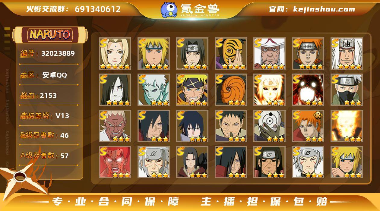 【HY643】本服排名68-44S-56A-无转生CD【S级忍者】:长门「秽土转生」(3星),猿飞日斩「秽土转生」(3星),波风水门「秽土转生」(3星),千手扉间「秽土转生」(3星),千手柱间「秽土转生」(3星),宇智波鼬「秽土转生」(3星),宇智波斑「秽土转生」(3星),宇智波斑「秽土转生·解」(3星),大野木「忍界大战」(3星),春野樱「忍界大战」(3星),宇智波带土「忍界大战」(3星),艾「忍界大战」(3星),宇智波鼬「须佐能乎」(3星),宇智波止水「须佐能乎」(3星),旗木卡卡西「须佐能乎」(3星),宇智波斑「木叶创立」(3星),千手柱间「木叶创立」(3星),艾「四代目雷影」(3星),罗砂「四代目风影」(3星),自来也(3星),自来也「舞之豪杰」(3星),大蛇丸(3星),自来也「传说中的三忍」(3星),纲手(3星),纲手「百豪」(3星),千手柱间(3星),千手扉间(3星),猿飞日斩(4星),宇智波斑(3星),波风水门(5星),药师兜「仙人模式」(3星),神秘面具男「红夜之刃」(3星),漩涡鸣人「九喇嘛连结」(3星),迈特凯「死门」(3星),佩恩「天道」(3星),佩恩·天道「超」(3星),宇智波佐助「永恒万花筒」(3星),宇智波斑 「白面具」(3星宇智波斑「白面具」),大筒木金式(3星),大筒木桃式(3星),大筒木舍人「最终章」(3星),漩涡鸣人「暴怒·第六尾」(3星),宇智波斑「五影会谈」(3星),漩涡鸣人·宇智波佐助(3星)【A级忍者】:艾「青年」(2星),长门「青年」(2星),波风水门「青年」(2星),达鲁伊「博人传」(2星),迪达拉(3星),迪达拉「秽土转生」(2星),大蛇丸「晓」(2星),奇拉比(2星),奇拉比「忍界大战」(2星),飞段(4星),飞段「死司凭血」(3星),干柿鬼鲛(5星),漩涡博人「桃式显现」(2星),漩涡鸣人「仙人模式」(2星),漩涡鸣人「九尾查克拉」(2星),机械鸣人「初始形态」(2星),迈特凯(5星),旗木卡卡西「万花筒写轮眼」(2星),旗木卡...