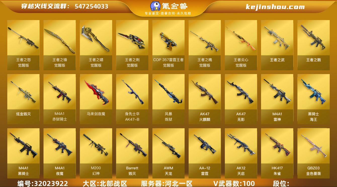 【ky6048】上海一区-51V-6王者武器数-0炫金武器数 【传说武器】:传说破晓 【热门武器】:传说破晓,QBZ03-金色蔷薇,HK417-朱雀,M200-幻神,白虎-电玩蓝兔*2,柯尔特-冠军之特*2,M4A1-黑骑士,COP 357-幻灵 【音效卡】:沙鹰-修罗-盛典舞曲音效卡*2,麒麟刺-百战金芒-盛典舞曲音效卡,炼狱-百战金芒-庆典舞曲音效卡 【皮肤】:幻神-宠儿-2021MVP,幻神-纸灯龙皮肤,幻神-电流骇客 皮肤,QBZ03-AG-CFPLS19冠军,QBZ03-巅峰荣耀皮肤,裁决-巅峰荣耀 皮肤,雷神-荣耀之魄,雷神-虎将,雷神-源计划2.0专属 皮肤,M4A1-再燃火线,火麒麟-百城,火麒麟-巅峰荣耀,火麒麟-心动糖果,毁灭-直播专属,毁灭-英雄计划 皮肤,轻型军用手斧-再燃火线,麒麟刺-甜蜜糖果 皮肤 【角色】:王者-魅影,王者潘多拉,奇洋探员,乔伊教练,葵-阿尔法武装,暗夜-X,飞虎队-X,风暴女,虎妞,嘉年华灵狐,灵狐者-X,麻雀,女主播,潘多拉-X,斯沃特-X,雪莉杨-摸金校尉,幽,游珑儿 【人偶武器】:AWM-灵狐-15周年嘉年华,生化手雷-机甲核心 【暴走生化】:超级对讲机 【挑战大师】:神圣爆裂者-末日III 【英雄级武器】:AK47-火麒麟,M4A1-雷神*2,M4A1-黑骑士,HK417-朱雀,无影-神兵利器,黑武士-锦绣游龙,QBZ03-金色蔷薇,烈火-动感闪耀,王者之势-觉醒版,白虎-电玩蓝兔*2,Barrett-毁灭,AWM-裁决,M200-幻神,炼狱-百战金芒,COP 357-幻灵,柯尔特-冠军之特*2,天神-动感闪耀,屠龙,唐刀-神工天巧,屠龙-动感闪耀,龙啸-热带奇洋,麒麟刺-百战金芒,丛林匕首-玄豹*2,高爆手雷-幻灵,高爆手雷-神工天巧,手雷-动感闪耀,高爆手雷-云龙*2,手雷-热带奇洋,高爆手雷-玄豹,高爆手雷-雷霆王者-觉醒版,闪光弹-幻灵,闪光弹-神工天巧,闪光弹-云龙*2,闪光弹-玄豹,闪光弹-雷霆王者-觉醒版*2,烟雾弹-神工天巧*2,烟雾弹-云龙*4,...