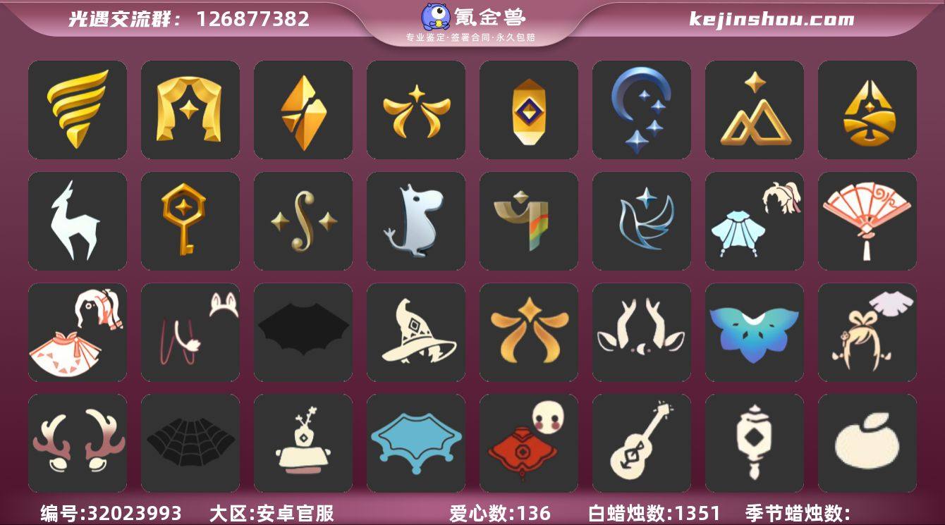 [17308420]iOS官服 手机账号 3珍稀物品 10毕业季 2毕业图 191蜡烛 【珍稀物品】:白枭(帝企鹅发),玫瑰花,透明蝶翼斗 【季节已毕业】:小王子季(王子季),风行季,潜海季,表演季,破晓季,欧若拉季(欧若拉),追忆季,夜行季,拾光季,九色鹿(九色鹿季) 【完成地图】:雨林,霞谷 【礼包】:牛仔裤(阔腿牛仔),运动鞋(跃动跑鞋),新年裤(瑞气服饰),火焰眼镜,爱心眼镜,蝴蝶结(大蝴蝶结),水母(水母肩饰),向日葵套(夏日有友礼包),巫师(巫师帽),蛛网朋克(蜘蛛朋克头),绊爱(绊爱斗篷)(绊爱礼包),橘子(大橘大利),雪花(雪花发夹),贝壳(贝壳发饰),兔子(玉兔头饰)(玉兔发饰)(兔子发饰),四叶草(四叶草头饰),星月头饰(星月头冠),九色鹿角(神鹿祝福头饰)(神鹿祝福礼包),新年耳钉(金鳞耳饰),彩虹耳钉(彩虹耳饰),彩虹耳机,枯角(巫树犄角),鹿角(圣诞鹿角),创始人(创始人斗篷),星球斗(星球夹克),欧若拉之翼,莲花斗(异彩莲花斗篷),福娃(福娃礼包)(春之日礼包)(铜钱斗),蝙蝠套(蝙蝠斗篷)(南瓜头),蜘蛛斗(蛛丝斗篷)(蛛网斗篷),透明蛛丝(透明蜘蛛斗),瑞雪(瑞雪斗篷)(暖冬瑞雪),白绒金(白雪斗篷),竖琴(雏鸟之琴),吉他(音韵吉他)(白吉他),人声乐器(欧若拉之声),红伞(瑞气纸伞),魔法棒(惊喜手杖)(仙女棒),灯笼(中秋灯笼),黄伞(夏日阳伞),献瑞折扇礼包,秋千(情人秋千),茶桌(花憩茶桌),茶壶(小憩茶桌),餐桌(野餐礼包),滑板(冲浪滑板)(冲浪板),大铁头 【裤子】:飞天裤(柔缎花边连)(九色鹿丝带裤),王子服(小王子套装),蓝绿裤(高领舞服),武士裤,背带裤,搓澡巾 【面具】:夜行毕业面具(棕熊面具),呼吸面具(潜水面具),贴花面具(丛林黑面具),黄眉企鹅面具 【面饰】:黑框眼镜(粗框眼镜),红耳机 【项链】:围巾(肩带) 【发型】:小王子发型,单侧绑发(单边小辫),飞天盘发(九色鹿丸子头),留辫蘑菇头,虚荣,归巢毕业发型(五塑彩羽发),若笠(箬笠) 【头饰】:平顶帽,蓝色音乐会...