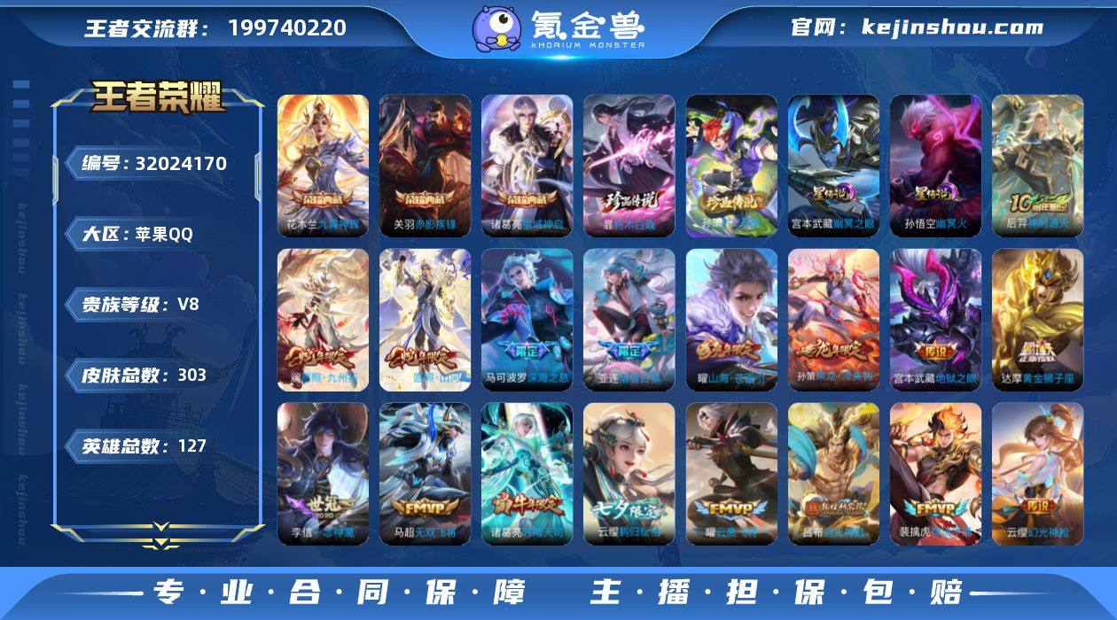 实名: 可修改 贵族等级: V8 英雄数: 127 皮肤数: 303 荣耀水晶: 星域神启,九霄神辉,赤影疾锋 珍品传说: 时之奇旅-孙策,朽木白哉 星传说: 幽冥之眼,幽冥火 传说皮: 黄金狮子座,云鹰飞将,一念神魔,地狱火,地狱之眼,飞鸢探春,时之恋人-刘备,末日机甲-孙策,无双飞将,山海·苍雷引,妄想实况,妄想奇谈,鹤归松栖(云缨),遇见神鼓,鲁班七号-时之奇旅,乘龙·淬吴钩,落雪白狼,幻光神枪,祥瑞亨通,神树通天 限定皮: 御风骁将,时雨天司,岱宗,至尊宝,默契交锋-花木兰,猪悟能,深海之息,五谷丰年,神器·万象笔,诗剑行,山海·玄木吟,鸣野蒿,逐霄战戟,愿照·山河定,愿照·九州拓