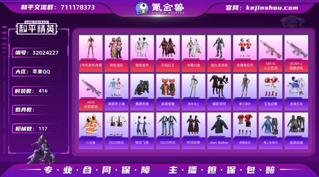 AL690442 【(极品土豪氪金百搭身法素材号!)主页好看 热门:螳螂 缤纷油彩 猪脸 明日香款战斗服 零款战斗服 小丑鱼 奇异狩猎者 蜘蛛侠 浪漫天命 雪山精英 暗影哥特 红眼罩 智能音符 冰霜白皇 炙焰红王 复仇流浪者 音爆索尼克 M416-心之恋语4级 SCAR-L-童趣迷兔6级 AKM-炫紫旋律4级 变形金刚飞行器 萌物绒绒飞行器 恐龙拽拽背包 童趣迷兔头盔】 热力值40599 枪皮数量117 粉装数7 套装数量108 时装数416 战备数87 其他武器皮肤114 头盔56 动作39 伙伴4 其他武器皮肤:GROZA-异彩先驱,GROZA-田园牧歌,AKM-彩虹符号,AKM-灼热熔岩,AKM-生命誓言,AKM-虎虎生威,AKM-破晓战魂,AKM-萌趣颜团子,M416-糯团青竹,M416-红色方程式,M416-月影鸳鸯,M416-蓝色火焰,M416-夜灯,M16A4-幻世战舞者,G36C-乌木金纹,G36C-时空追击者,QBZ-飞驰魅影,QBZ-未来歌姬,蜜獾-垂柳戏鸭,蜜獾-娇憨猪猪,M762-瑞龙福将,M762-天降萌叽,M762-烈焰拳霸,AC-VAL-乌木金纹,AUG-凝视深渊,AUG-青春冒险家,Mk47-青春冒险家,Mk47-妙红点点,Mk47-乌木金纹,SCAR-L-玉兔迎春,SCAR-L-黄金龙骨,SCAR-L-红色方程式,M200-仲夏莫吉托,M200-惊鸿侠骨,莫辛纳甘-乌木金纹,Win94-瑞龙福将,Win94-夏日绵绵冰,Kar98K-炫彩节奏,Kar98K-飞驰魅影,Kar98K-乌木金纹,Kar98K-电玩视界,M24-奇异狩猎者,M24-乌木金纹,M24-百合蜜语,M24-仲夏莫吉托,AWM-垂柳戏鸭,AMR-妙红点点,SLR-彩虹符号,SLR-娇憨猪猪,SKS-炫彩节奏,SKS-时空追击者,SKS-迅猛狂鲨,Mk14-童趣迷兔,Mk14-乌木金纹,VSS-碧影闪光,VSS-田园牧歌,Mini14-异彩先驱,QBU-青春冒险家,M417-惊鸿侠骨,野牛-天星战神,野牛-青春冒险家,野牛-乌木金纹,汤姆逊-天降萌叽,汤姆逊-炫彩节奏,汤姆逊-耀粉歌者,汤姆逊-异彩先驱,汤姆逊-梦之光华,UMP45-灵符少年,UMP45-春...
