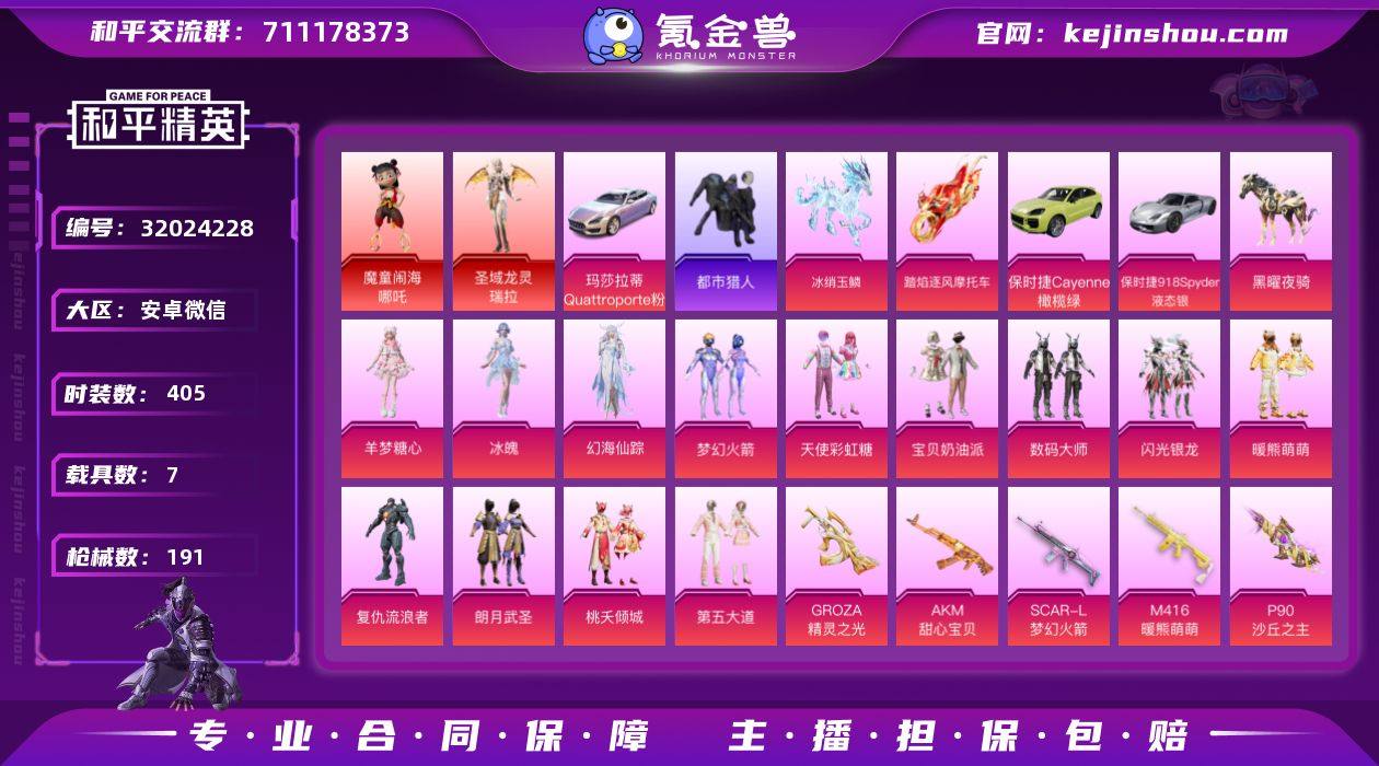 安卓微信-7王牌印记-3红装-14粉装-19特效枪-7载具-85820热力值-118套装-191枪皮-2卓越印记-2传奇印记 【3红装】魔童闹海-哪吒/1级,暮色玫影-艾丽娅/1级,圣域龙灵-瑞拉/3级 【14粉装】套装-梦幻火箭,套装-朗月武圣,角色-绝对恒星,套装-桃夭倾城,套装-暖熊萌萌,套装-闪光银龙,套装-天使彩虹糖,套装-数码大师,套装-第五大道,角色-幻海仙踪,角色-羊梦糖心,角色-冰魄,套装-宝贝奶油派,角色-复仇流浪者 【19特效枪】燃烧瓶-薄荷可可/3级,M249-绝对恒星/2级,AKM-甜心宝贝/1级,M416-暖熊萌萌/1级,P90-沙丘之主/3级,ACE32-萌骑漫游/4级,MG-36-沧焰双生/5级,SCAR-L-梦幻火箭/1级,Mk14-福马献瑞/5级,GROZA-精灵之光/3级,P90-魔童闹海 敖丙/1级,SCAR-L-桃夭倾城/1级,AKM-暮色玫影/3级,AKS-74U-森灵之息/5级,ARX-无垠阁/5级,M416-灵猫魔法师/3级,DP-28-豹影疾电/5级,SCAR-L-魔童闹海 哪吒/9级,Vector-最终圣卫者/3级 【3稀有紫装】都市猎人,暗影哥特,东方飞龙 【7稀有载具】踏焰逐风摩托车,黑曜夜骑,保时捷918 Spyder(液态银),保时捷Cayenne(橄榄绿),冰绡玉鳞,玛莎拉蒂Quattroporte(幻星粉)/2级,暮色幽蹄 【1僚机】僚机-圣域龙宝 【111稀有时装】梦幻火箭,宝贝奶油派,天使彩虹糖,第五大道,瑞拉/3级,哪吒/1级,幻海仙踪,羊梦糖心,冰魄,绝对恒星,SS35特训,午间小调,SS36特训,极光猎影,银色战姬,琴音绮想,幽澜祭司,镜光械姬,画境星梦,SS34特训,朱霞炽焰,狂鲨锋刃,阳光菠萝,都市猎人,暗影哥特,懒羊羊,东方飞龙,紫俏灵猫,凌霄紫焰,粉黛兰香,擎苍青焰,炫彩糖果,绯色魅影,萌鸡速递,书海巡游,风迹短诗,甜心蒙太奇,瑰梦爱神,秘语星愿,超感刻度,雪国风尚,复仇流浪者,暖熊萌萌,闪光银龙,朗月武圣,桃夭倾城,数码大师,暗夜行者,街头风暴,晶辉守护,英勇保护者,