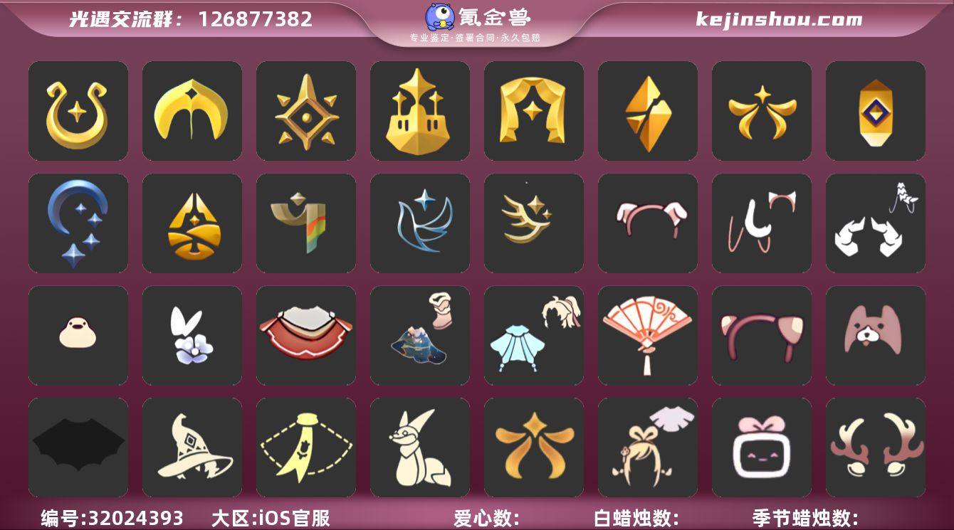 账号类型: 手机账号 季节已毕业: 魔法季,圣岛季,预言季,梦想季,表演季,破晓季,欧若拉季,夜行季,追忆季,归巢季,彩染季,青鸟季,迁徙季 完成地图: 晨岛,云野,雨林,霞谷,暮土,禁阁,全图毕业 珍稀物品: 阿努比斯(狗头),白枭,透明蝶翼斗,魔法季耳坠 礼包: 蝙蝠套,巫师,围巾,小狐狸,欧若拉之翼,绊爱,大铁头,鹿角,蜘蛛斗,牛仔裤,兔子鞋,运动鞋,秋千,灯笼,致爱装扮,人声乐器,彩虹帽,雪花球,橘子,贝壳,红伞,兔子,南瓜,枯角,雪花,鲤鱼,tgc,水母,猫套,猫背饰,星月头饰,彩虹耳钉,彩虹耳机,新年裤,四叶草,暗彩装扮,爱心眼镜,雪人鞋,创始人,锦标赛桂冠,献瑞折扇礼包,小狗周年发饰,潮汐套装礼包,粽子发饰礼包,青衫落拓礼包,缤纷飘带斗篷礼包,小黄鸭发饰礼包,蝴蝶与花发饰礼包,冥龙套装礼包,皮皮猫套装礼包,绿茸茸卷耳发饰礼包 裤子: 武士裤,背带裤,白棉裤,搓澡巾 面具: 黄鼠狼,红狐狸,阿努比斯 面饰: 魔法季耳坠,红耳机 项链: 围巾 发型: 蝴蝶结,正太,樱花,公主头,虚荣,猫耳,白枭 头饰: 花环 斗篷: 白金,红金,白鸟斗,花瓣斗篷,荧蓝斗篷 配饰: 雨伞,排箫,高音钢琴,吉他,笛子,大铃铛乐器,乐器 亮点: 重塑药水16,有织光季季卡