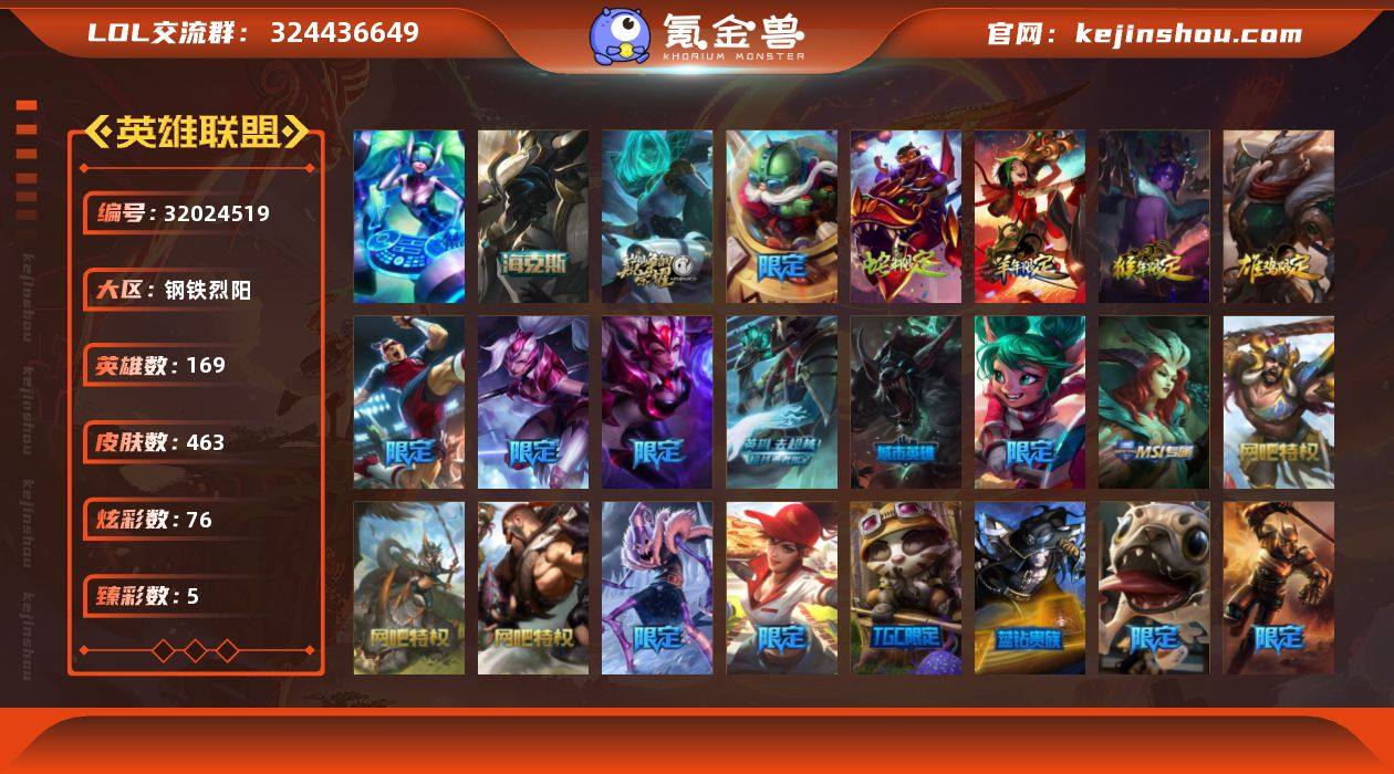 t36958【钢铁烈阳】463皮肤 76炫彩 5臻彩 2神话/92限定/41传说/169英雄 账号等级:293 【重要头像】击拳 KDA萨勒芬妮 披萨鸡 送披萨的小姐姐希维尔 此志无双羽饰骑士 【重要皮肤】零之枪骑赫卡里姆 哥特萝莉安妮 银白审判凯尔 电玩女神厄运小姐 电玩勇者锐雯 神龙烈焰金克丝 古琴余韵娑娜 紫金罗刹莫甘娜 司马懿仲达 神龙之翼库奇 胜利之树茂凯 胜利女神奥莉安娜 胜利枪神格雷福斯 胜利之剑亚托克斯 甜心宝贝娑娜 觅心游侠卢锡安 觅心魔灵奥莉安娜 觅心女王艾希 觅心猎手薇恩 寒冬精灵璐璐 雪球也能爆炸吉格斯 冰雪女神辛德拉 魄罗骑士瑟庄妮 平安夜女神娑娜 魅惑女巫莫甘娜 魅惑女巫崔丝塔娜 死亡誓约劫 泳池派对李青 泳池派对雷克顿 电玩战魂赫卡里姆 送披萨的小姐姐希维尔 克格汪 制胜金靴李青 SKTT1阿利斯塔 SKTT1卡莉丝塔 SKTT1瑞兹 SKTT1阿兹尔 SSW锤石 SSW泰隆 SSW辛吉德 SKTT1劫 SKTT1李青 暗杀星奥莉安娜 暗杀星蒙多 暗杀星努努和威朗普 暗杀星伊泽瑞尔 Fnatic迦娜 Fnatic古拉加斯 冰雪节格雷福斯 冰雪节辛吉德 防暴士兵格雷福斯 防暴士兵辛吉德 防暴天使凯尔 钢铁之翼艾尼维亚 冠军典狱长锤石 冠军之矛卡莉丝塔 冠军之血希瓦娜 冠军之隐劫 鬼影森森茂凯 鬼影重重魔腾 海贼瑞兹 胡桃夹子萨科 警用试作体K9内瑟斯 蓝色忧郁崔斯特 密林猎手提莫 南瓜头费德提克 圣诞精灵崔丝塔娜 圣诞开心鬼提莫 圣诞狂欢努努和威朗普 圣诞老人古拉加斯 圣诞玩偶波比 圣诞驯鹿克格莫 糖果使徒费德提克 外星装甲库奇 喜庆之树茂凯 邪恶圣诞老人维迦 幸福女神乐芙兰 雪默丁格 雪装奈德丽 野兽猎人德莱文 野兽猎人瑟庄妮 野兽猎人泰达米尔 英勇玩具兵普朗克 永恒之森乐芙兰 勇者阿狸 勇者奈德丽 暗影沃里克 冠军之箭艾希 阿木...