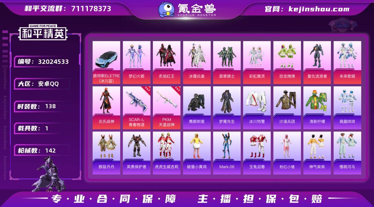 M1046362【身法号1载具-9粉装-2特效枪 复仇流浪者 梦幻火箭 青春物语6级】安卓手Q-1载具-9粉装-2特效枪-138套装-142枪皮-2王牌印记-坚韧铂金Ⅴ-50181热力值【1载具】路特斯ELETRE(冰川蓝)【9粉装】恐龙拽拽 翡翠骑士 角色-复仇流浪者 梦幻火箭 冰霜白皇 彩虹鹿灵 炎氏战神 未来歌姬 炙焰红王【2特效枪】SCAR-L-青春物语[6级] PKM-天星战神[4级]【1稀有】NV战队服【3飞行器】粉色滑翔尾迹 红色滑翔尾迹 梦幻火箭飞行器【2头盔】梦幻火箭头盔 童趣迷兔头盔【1背包】梦幻火箭背包【268其它衣服和枪皮】角色-英勇保护者 海盐绵绵冰 黄色伏地魔 冰川特警 街头潮人 清新柠檬 沙漠兵团 玉兔迎春 青春冒险家 牛气满满 长空猛禽 浓情蜜辣 蓝彩潮人 SS23特训 超能拳王 瑞龙福将 怒火燎原 香榭午后 黄色运动 冰川格斗者 夏日音浪 科技之星 SS20特训 晨曦薄雾 热情海星 SS36特训 战地督导 星河入梦 骑行爱好者 粉红小猪 虎虎生威吉莉 竞技名士 坚韧舞者 潮流游乐家 豚鼠丹丹 猎鹰 治愈之星 SS14特训 惊鸿侠骨 特战装甲 春日漫步 酒红色名流 绚烂繁星 破蛋小黄鸡 竞技达人朋克 娇憨猪猪 SS27特训 沙漠探路者 湖蓝色名流 完美偶像 黑色伏地魔 光之冒险 燃烧卡路里 龙的传人 暗影爵士 熠彩粉晶 都市漫游者 特训学院 极地朋克 橘黑制服 耀眼新星 SS24特训 梦魇先生 格斗先锋 神气柴柴 西部风情 击剑大师 SS22特训 炫光向阳 蓝色守护者 热血青春 SS18特训 魅力单车 野性山猫 萌黄之夏 SS19特训 夏雨游龙 深蓝色名流 SS26特训 牛气冲天 极速竞梦 青年教官 锦衣飞扬 SS17特训 萌趣咩咩 都市魅力 福星高照 甜蜜告白 绮丽涂鸦 飞驰魅影 猛禽 虚音幻奏 紫翼圣骑 纯真浪花 千禧之恋 SS28特训 迅猛虎鲸 团圆交子 SS25特训 鹰眼刺客 炫蓝之夏 野性战魂 龙腾端午 灰色格斗者 暗黑裁决 蓝色运动 沙漠毒蛇 缤纷果语 吉莉礼服 轻风白浪 角色-Mark...