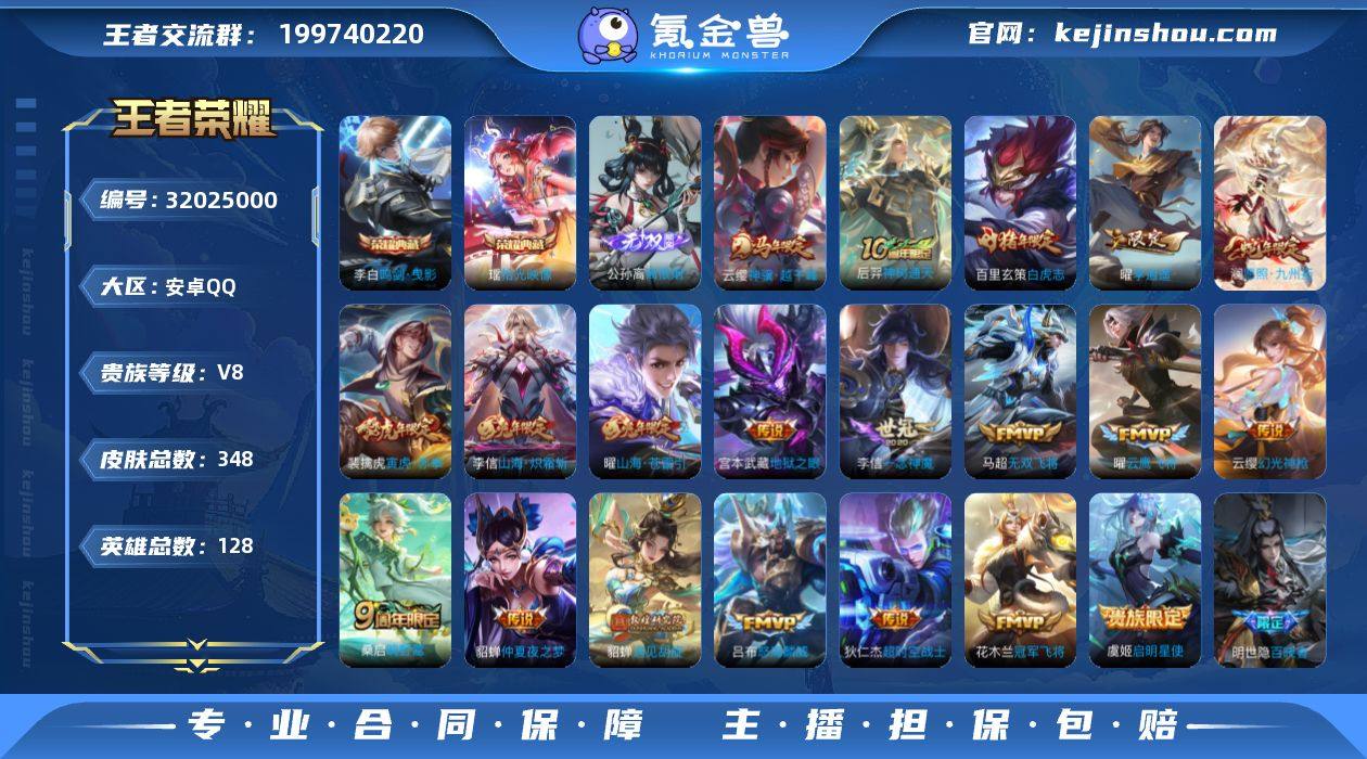 【4804】安卓Q-V8-至尊星耀IV段位-128英雄-348皮肤-2典藏皮肤-1无双-20传说-106史诗 【英雄全皮】:高渐离全皮,孙权全皮,敖隐全皮,空空儿全皮,影全皮 【荣耀典藏】:李白鸣剑曳影,瑶拾光映像 【无双皮肤】:公孙离离恨烟 【传说皮肤】:云缨神骥越千峰,后羿神树通天,澜愿照九州拓,云缨幻光神枪,桑启鸣野蒿,曜山海苍雷引,李信山海炽霜斩,吕布怒海麟威,马超无双飞将,裴擒虎寅虎赤拳,貂蝉遇见胡旋,曜李逍遥 ,虞姬启明星使,曜云鹰飞将,李信一念神魔,百里玄策白虎志,花木兰冠军飞将,貂蝉仲夏夜之梦,宫本武藏地狱之眼,狄仁杰超时空战士 【限定皮肤】:公孙离离恨烟,蒙犽顽岩魄,大乔绒语心约,姜子牙天穹之誓,杨戬破阵退雄兵,狄仁杰阴阳师,赵云皇家上将,墨子神迹守卫,嬴政优雅恋人,庄周高山流水,高渐离死亡摇滚,高渐离玩趣恶龙,钟无艳超时空战士,白起夜都怪侠,芈月幻夜卜梦,元歌云间偶戏,元歌无心,甄姬游园惊梦,甄姬落雪兰心,马可波罗暗影游猎,马可波罗山海玄木吟,狄仁杰魔术师,狄仁杰万华元夜,达摩星际陆战队,达摩沙漠行僧,项羽海滩派对,老夫子醍醐杖,老夫子航海奇遇记,貂蝉遇见胡旋,程咬金演武夺筹,韩信逐梦之影,韩信傲雪梅枪,王昭君午后时光,兰陵王金庭之子,亚瑟潮玩骑士王,孙悟空大圣娶亲,孙悟空孙行者,后羿圣弓游侠,李元芳云中旅人,虞姬启明星使,钟馗驱傩正仪,干将莫邪冰霜恋舞曲,干将莫邪真爱魔法,雅典娜黎明之约,蔡文姬繁星吟游,鬼谷子原初探秘者,鬼谷子五谷丰年,黄忠火炮绅士,苏烈千军破阵,百里玄策白虎志,百里玄策原初追逐者,梦奇顽趣,沈梦溪大漠名商,明世隐疑决卦,明世隐吟游魔法,裴擒虎李小龙,裴擒虎寅虎赤拳,裴擒虎擒涛扼浪,狂铁电玩高手,米莱狄胡桃异想国,云中君纤云弄巧,李信山海炽霜斩,猪八戒猪悟能,上官婉儿神器...