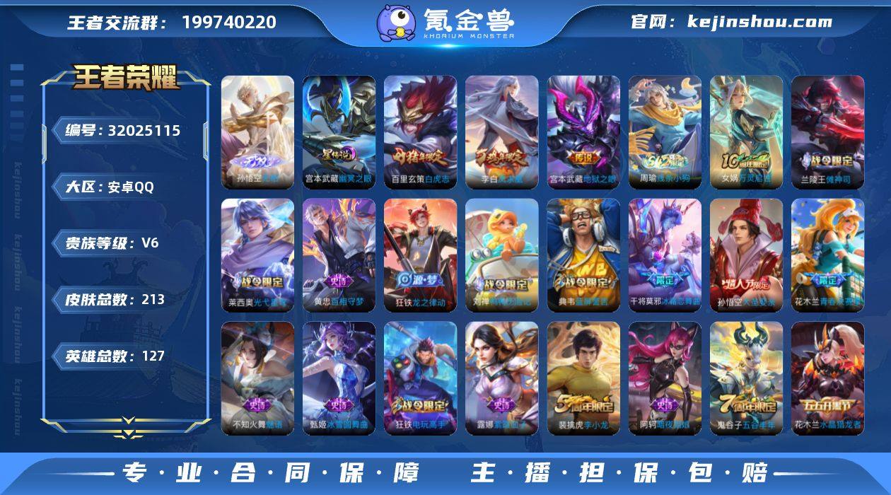 安卓Q-V6-至尊星耀II段位-126英雄-250皮肤-1典藏皮肤-7传说-55史诗 【英雄全皮】:孙权全皮,空空儿全皮,影全皮 【荣耀典藏】:关羽赤影疾锋 【传说皮肤】:后羿神树通天,桑启鸣野蒿,李信山海炽霜斩,马超无双飞将,铠绛天战甲,曜云鹰飞将,虞姬云霓雀翎 【限定皮肤】:蒙犽顽岩魄,蔡文姬夏日便利店,大乔绒语心约,虞姬夏日便利店,姜子牙天穹之誓,狄仁杰阴阳师,赵云皇家上将,墨子神迹守卫,孙尚香蔷薇恋人,钟无艳超时空战士,白起夜都怪侠,吕布猎兽之王,元歌无心,狄仁杰魔术师,项羽海滩派对,孙悟空孙行者,李元芳云中旅人,蔡文姬奇迹圣诞,裴擒虎擒涛扼浪,云中君纤云弄巧,李信山海炽霜斩,西施玲珑珍味,鲁班大师探海日志,桑启海盐诗旅,艾琳流音漫舞,司空震地狱燃心,张良古海寻踪,高渐离燃音魔法,妲己灵卜魔法,鬼谷子天穹祈灯,姬小满妄想食味,沈梦溪龙舞盛年,鲁班七号蔬乡物语,李元芳蔬乡物语,刘邦剑破天穹,程咬金群星魔术团,镜青焰无极,项羽苍威无极,周瑜熔金海岸 【年限皮肤】:李信山海炽霜斩 【赛季限定】:李元芳云中旅人,桑启海盐诗旅,裴擒虎擒涛扼浪,鲁班大师探海日志,张良古海寻踪,鬼谷子天穹祈灯,刘邦剑破天穹,姜子牙天穹之誓,东皇太一噬灭天穹,太乙真人谧流熔炉,钟馗虚灵犬护,甄姬逆浪荇歌,亚瑟荣光之誓 【战令限定】:吕布猎兽之王,墨子神迹守卫,白起夜都怪侠,钟无艳超时空战士,西施玲珑珍味,司空震地狱燃心,艾琳流音漫舞,高渐离燃音魔法,妲己灵卜魔法,鲁班七号蔬乡物语,李元芳蔬乡物语,镜青焰无极,项羽苍威无极,蔡文姬夏日便利店,虞姬夏日便利店,亚连破空之剑,孙悟空神迹守卫,百里守约百相守梦,老夫子百相守梦,刘禅鸭鸭历险记,沈梦溪鸭鸭历险记,周瑜百相守梦,孙策百相守梦,周瑜线条小狗,小乔线条小狗 【史诗皮肤】:露娜紫霞...