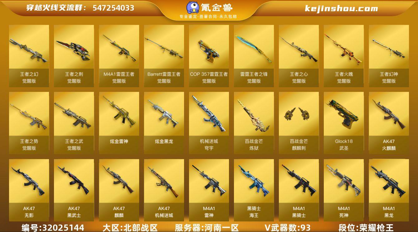 河南一区-118V-25王者武器数-2炫金武器数 【热门武器】:QBZ03-金色蔷薇,Scar Light-白虎,HK417-朱雀,M4A1-青龙,M200-幻神,M200-竞技荣光,死亡之眼,荣耀世冠-柯尔特,Kar98K-星神,M4A1-黑骑士,汤姆逊-烈龙*6,RPK-盘龙*6,加特林-炼狱,COP-白鲨,沙鹰-修罗*6,荣耀世冠-龙啸,金刚伞 【王者炫金武器】:炫金黑龙,炫金雷神 【音效卡】:M4A1-雷神音效卡,M4A1-黑龙音效卡,M4A1-黑骑士音效卡,Barrett-毁灭音效卡,Barrett-碧霄极光音效卡,炼狱-百战金芒-庆典舞曲音效卡 【皮肤】:幻神-AG-CFPLS17冠军,幻神-电竞之星 皮肤,Scar Light-白虎-暗星,金色蔷薇-电竞之星 皮肤,AWM-裁决-百城联赛天津皮肤,裁决-叶芒苍灵 皮肤,裁决-运输船 皮肤,雷神-暗月,雷神-虎将*3,雷神-烈虎皮肤,雷神-荣耀世冠AG,M4A1-再燃火线,火麒麟-雷神,火麒麟-华夏之心,火麒麟-轻羽皮肤,火麒麟-平天大圣,火麒麟-白虎,毁灭-黑大圣皮肤,毁灭-风暴*2,毁灭-英雄计划 皮肤,M4A1-千变-孔明皮肤,黑龙-能量核心*2,黑龙-暗月,M4A1-黑龙-361,黑骑士-暗月,黑骑士耀金皮肤,无影-能量核心,死神-秘银,战神-紫绶金章皮肤,战神-流金岁月皮肤,AK47-B-常胜将军-曹操*2,AK47-B-常胜将军-刘备*2,AK47-B-常胜将军-孙权,天龙-能量核心,AWM-天龙-传奇70KG,AWM-天龙-传奇白鲨,极光-能量核心,修罗-能量核心*2,修罗-百战金芒 皮肤,屠龙-荣耀之锋*2,屠龙-惊鸿 皮肤,轻型军用手斧-再燃火线 【角色】:零,葵,樱,魅影,炫,零·纪元,王者-魅影,修道士,葵-阿尔法武装,暗夜-X,北极狐-X,初恋灵狐,风暴女,虎妞,娟娟,兰-海滩派对,兰-新年限定,兰妹妹,零-水下丽影,灵狐者-X,灵狐者-黄金海岸,灵狐者-职业经理,龙儿,龙儿-小淘气,麻雀,潘多拉-X,潘多拉-甜心教官,潜龙队-X,邱刚敖,青霞仙子,蛇姬,蜀雪,...