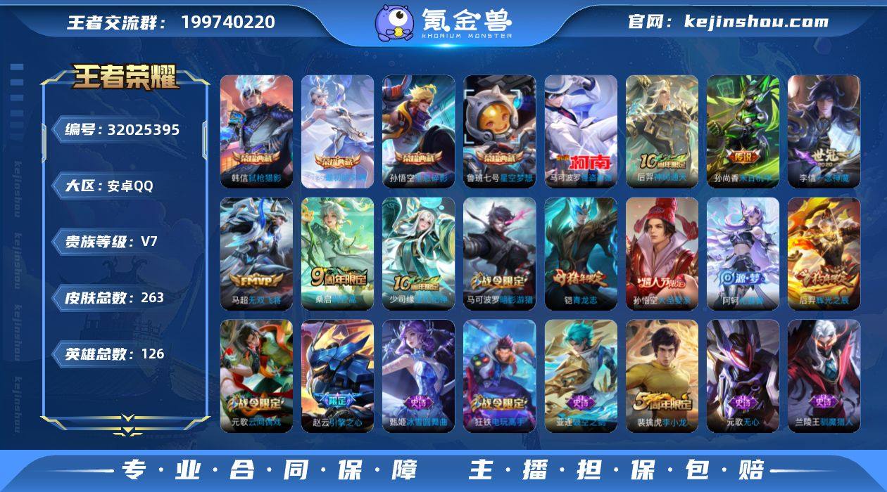 实名: 可修改 性别: 男号 贵族等级: V7 英雄数: 126 皮肤数: 263 荣耀水晶: 星空梦想,全息碎影,弑枪猎影,最初的交响 珍品传说: 怪盗基德 传说皮: 一念神魔,末日机甲-孙尚香,无双飞将,神树通天 限定皮: 李小龙,游园惊梦,梁祝,引擎之心,辉光之辰,青龙志,大圣娶亲,五谷丰年,鸣野蒿,陌上桑 亮点: 【优质装备】:星空梦想(太空人),全息碎影(猴子典藏),弑枪猎影(韩信典藏),最初的交响(伽罗典藏),怪盗基德,一念神魔,末日机甲-孙尚香(绿蚂蚱),无双飞将