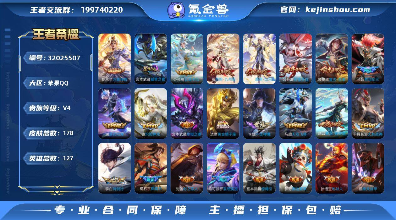 贵族等级:V4 典藏皮肤数:1 珍品无双皮肤数:0 无双皮肤数:0 珍品传说皮肤数:0 传说皮肤数:22 史诗皮肤数:48 皮肤数:178 英雄数:127 段位:荣耀王者 卖家说:王者 王者苹果q区v7打野号,省标赵云,现赛季王者85星,跟图一样