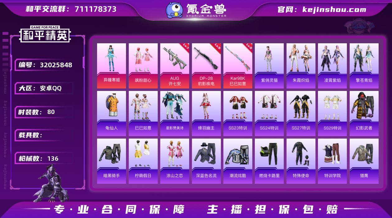 安卓 手Q-2粉装-4特效枪-0载具-2粉色飞行器-34642热力值-2王牌印记-80套装-136枪皮【热门品类】:套装-龟仙人【粉色套装】:粉装-飒粉甜心,角色-异瞳寒姬【粉色枪皮等级】:AUG-许七安(七级),Kar98K-巳巳如意(五级),Mk14-福马献瑞(五级),DP-28-豹影疾电(五级)【粉色枪皮】:AUG-许七安,Kar98K-巳巳如意,Mk14-福马献瑞,DP-28-豹影疾电【粉色飞行器】:炫彩糖果飞行器,极意拳锋飞行器【粉色降落伞】:龙珠超降落伞,飒粉甜心降落伞,精灵梦叶罗丽降落伞,金丰海韵降落伞,桃粉嫣然降落伞,炫彩糖果降落伞【稀有套装】:套装-龟仙人,套装-巳巳如意,套装-雪国风尚,套装-炫彩糖果,套装-马上有钱,套装-星影赞美诗,角色-绛羽幽主,套装-朱霞炽焰,套装-凌霄紫焰,套装-擎苍青焰,角色-紫俏灵猫【稀有枪皮】:AUG-冰晶雪宝,AKM-彩虹符号,AKM-星之彼岸,AKM-破晓战魂,M16A4-红色方程式,SCAR-L-夜灯,SCAR-L-炫彩节奏,SCAR-L-玉兔迎春,SCAR-L-红色方程式,M416-糯团青竹,M416-红色方程式,M416-蓝色火焰,GROZA-懵萌河马,AUG-天降萌叽,AUG-耀粉歌者,AUG-绝对恒星,QBZ-彩虹符号,QBZ-洛神天依,M762-天降萌叽,M762-彩虹符号,Mk47-妙红点点,G36C-懵萌河马,蜜獾-天降萌叽,ARX-凌霄紫焰,UZI-啾咪啾咪,UZI-天降萌叽,UMP45-夜灯,UMP45-涂山之恋,UMP45-生命誓言,UMP45-蓝色火焰,Vector-彩虹符号,Vector-生命誓言,汤姆逊-智耀战神,JS9-凌霄紫焰,P90-巳巳如意,Kar98K-红色方程式,M24-炫彩节奏,SKS-糯团青竹,VSS-彩虹符号,Mini14-涂山之恋,莫辛纳甘-懵萌河马,AMR-妙红点点,S686-生命誓言,S686-巳巳如意,S12K-玩趣呆呆,S12K-破晓战魂,S12K-夜灯,DBS-彩虹符号,DBS-第五大道,M249-妙红点点,M249-星之彼岸,DP-28-彩虹符号,MG3-妙红点点,MG3-幻世战舞者,PKM-懵萌河马,MG-36-...
