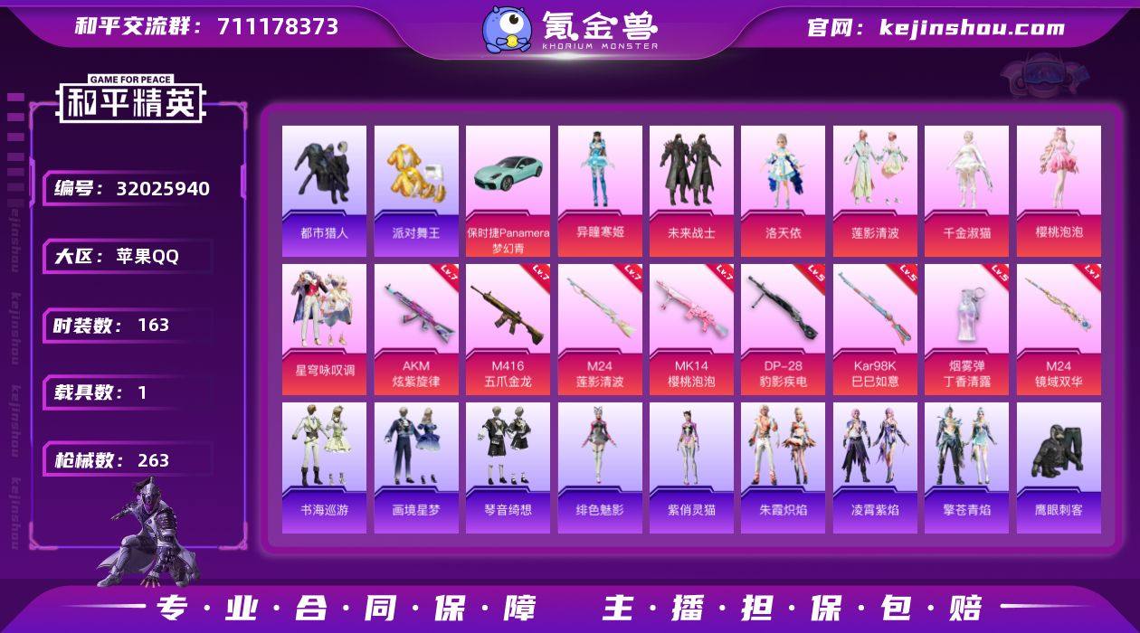 【ky84】安卓 手Q-1神装-6粉装-8特效枪-1载具-4粉色飞行器-87064热力值-14王牌印记-200套装-283枪皮 【红色神装等级】:金蛇镇世-烛九(二级) 【红色角色神装】:金蛇镇世-烛九 【热门品类】:套装-都市猎人,套装-深海小丑鱼,套装-忍者信条,套装-龟仙人 【粉色套装】:粉装-天使彩虹糖,角色-圣堂之誓,角色-金域紫灵,角色-萨利娅,角色-霁蓝缠春 【粉色枪皮等级】:AKM-星际浪客(四级),AKM-暮色玫影(三级),SCAR-L-锦绣绵绵(五级),M416-心之恋语(六级),UMP45-量子极限(五级),Kar98K-巳巳如意(五级),Mk14-樱桃泡泡(五级),DP-28-豹影疾电(五级) 【粉色载具】:暮色幽蹄 【粉色枪皮】:AKM-星际浪客,AKM-暮色玫影,SCAR-L-锦绣绵绵,M416-心之恋语,UMP45-量子极限,Kar98K-巳巳如意,Mk14-樱桃泡泡,DP-28-豹影疾电 【粉色飞行器】:龙翔九天飞行器,暮色之舞飞行器 【粉色降落伞】:快乐主宰降落伞,至尊龙雀降落伞,星之彼岸降落伞,葫芦兄弟降落伞,洛神天依降落伞,恐龙拽拽降落伞,旋转彩虹降落伞,音爆索尼克降落伞,炎氏战神降落伞,未来歌姬降落伞,圣堂之誓降落伞,夜幕颂歌降落伞,精灵梦叶罗丽降落伞,金丰海韵降落伞,圣域龙灵降落伞,星穹咏叹调降落伞,无垠阁降落伞,喜羊羊与灰太狼降落伞,炫彩糖果降落伞,暮色玫影降落伞,罪夜之冕降落伞 【稀有套装】:套装-龟仙人,套装-巳巳如意,套装-炫彩糖果,套装-雏菊兔兔,套装-萝兰蝴蝶,角色-达芬奇,套装-糖糖葫芦,套装-青团波波,套装-棉花软糖,角色-摩登魅猫,角色-光矢逐梦,套装-燕燕于飞,套装-鱼渊荷华,套装-朱霞炽焰,套装-凌霄紫焰,套装-擎苍青焰,角色-紫俏灵猫,套装-书海巡游,套装-画境星梦,套装-琴音绮想 【稀有枪皮】:AKM-冰凉西瓜,AKM-夜灯,AKM-影袭,AKM-星之彼岸,AKM-破晓战魂,AKM-缤纷海域,AKM-萌趣颜团子,A...