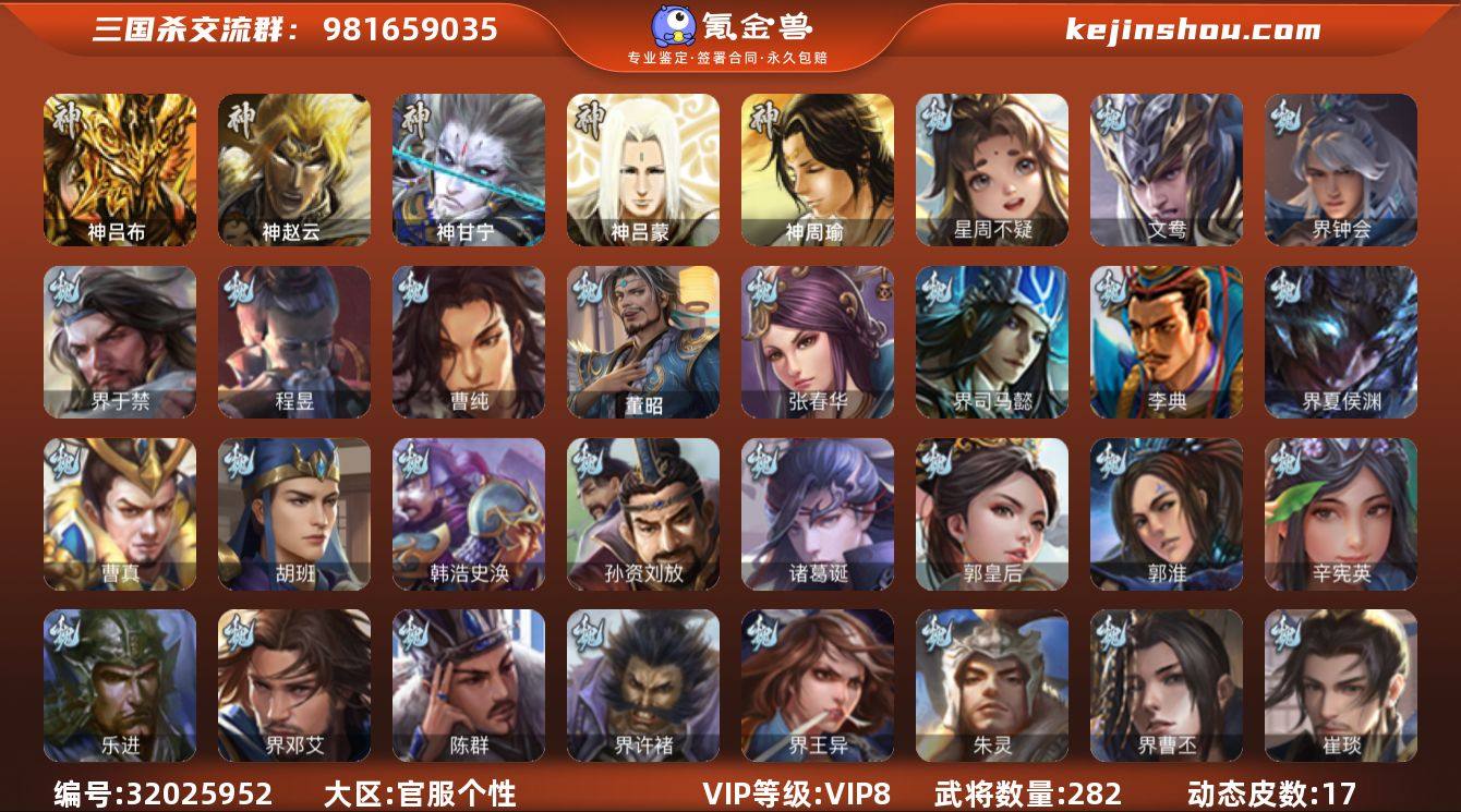 神吕布,神赵云,神甘宁,星周不疑,界钟会,界于禁,曹纯,程昱,谋黄忠,谋夏侯氏,谋马超,赵襄,张星彩,花鬘,谋黄盖,吴景,骆统,界徐盛,文鸯,左慈,星黄忠,苏飞,沮授,界左慈,卑弥呼,兀突骨,神吕蒙,神周瑜,SP关羽,SP蔡文姬,乐进,曹昂,诸葛诞,朱灵,文聘,SP姜维,张春华,钟会,曹冲,郭淮,满宠,界王异,界曹操,界司马懿,界夏侯惇,界张辽,界许褚,界郭嘉,李典,曹真,韩浩史涣,陈群,曹休,钟繇,司马朗,王基,郭皇后,孙资刘放,辛宪英,鲁芝,界荀彧,杜畿,界曹丕,界邓艾,张恭,界曹植,界满宠,卞夫人,崔琰,谋徐晃,牵招,胡班,界夏侯渊,唐咨,董昭,SP孙尚香,夏侯霸,马良,关兴张苞,廖化,界马岱,关平,简雍,刘封,界法正,界关兴张苞,界刘备,界关羽,界张飞,界赵云,SP徐庶,吴懿,周仓,张松,刘谌,糜竺,李严,黄皓,界黄月英,赵统赵广,严颜,界庞统,界祝融,邓芝,界周仓,蒋琬,刘巴,界吴懿,彭羕,谋庞统,谋姜维,谋张飞,诸葛果,糜芳傅士仁,甘夫人,孙茹,凌操,大乔小乔,诸葛恪,诸葛瑾,孙鲁育,程普,韩当,潘璋马忠,虞翻,界甘宁,界吕蒙,界黄...