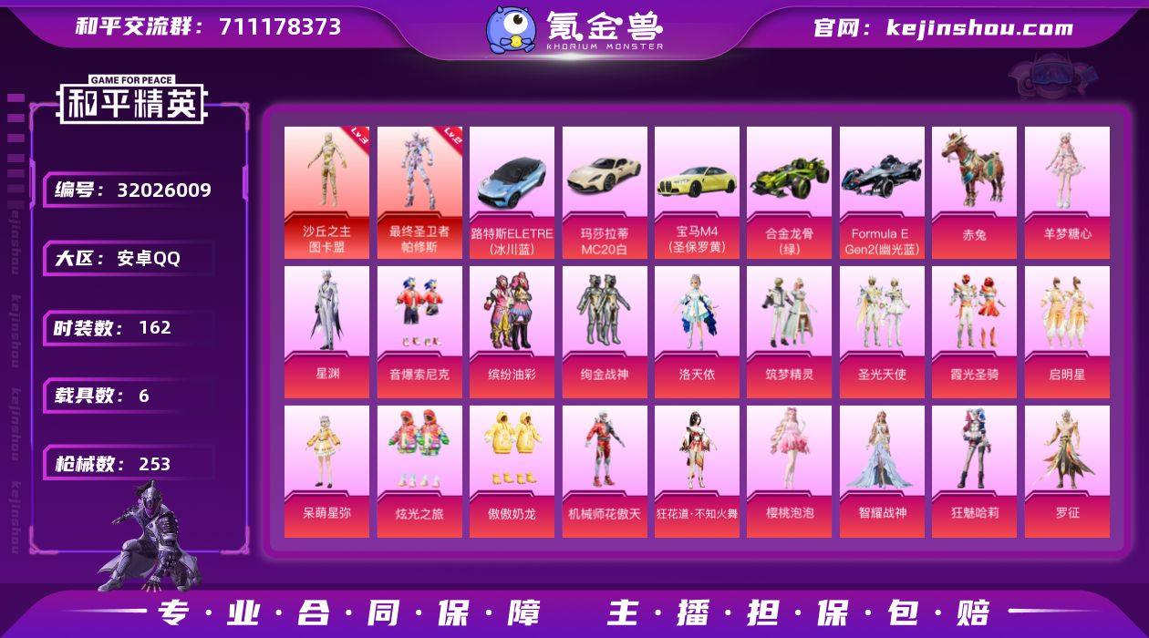 【特价出售/店主推荐】 安卓 手Q-无敌战神框-2神装-19粉装-20特效枪-6载具-6粉色飞行器-95155热力值-18王牌印记-162套装-253枪皮 【红色神装等级】:最终圣卫者-帕修斯(二级),沙丘之主-图卡盟(三级) 【红色角色神装】:最终圣卫者-帕修斯,沙丘之主-图卡盟 【热门品类】:粉装-音爆索尼克,粉装-缤纷油彩,套装-六号树人,套装-龟仙人,角色-六号稻草人,撬棍-龙胆亮银枪 【粉色套装】:粉装-缤纷油彩,粉装-绚金战神,角色-洛天依,粉装-筑梦精灵,粉装-圣光天使,粉装-霞光圣骑,粉装-启明星,粉装-音爆索尼克,角色-呆萌星弥,粉装-炫光之旅,粉装-傲傲奶龙,粉装-机械师花傲天,角色-狂花道·不知火舞,角色-樱桃泡泡,角色-智耀战神,角色-狂魅哈莉,角色-罗征,角色-星渊,角色-羊梦糖心 【粉色枪皮等级】:SCAR-L-青春物语(一级),SCAR-L-甜梦小狐(五级),M416-五爪金龙(一级),M416-心之恋语(七级),M416-全功率超战(一级),M416-超新星(三级),M762-青锋波束(五级),UMP45-启明星(四级),Vector-最终圣卫者(三级),AKS-74U-森灵之息(五级),P90-沙丘之主(三级),Kar98K-巳巳如意(五级),Mk14-盛世惊鸿(三级),Mk14-甜梦熊击(五级),Mk14-福马献瑞(三级),DP-28-暗夜鎏金(四级),DP-28-豹影疾电(五级),MG3-洛神天依(五级),MG-36-沧焰双生(五级) 【粉色载具】:路特斯ELETRE(冰川蓝),玛莎拉蒂MC20(星石白),宝马M4(圣保罗黄),合金龙骨(绿),Formula E Gen2(幽光蓝),赤兔 【粉色枪皮】:SCAR-L-青春物语,SCAR-L-甜梦小狐,M416-五爪金龙,M416-心之恋语,M416-全功率超战,M416-超新星,M762-青锋波束,UMP45-启明星,Vector-最终圣卫者,AKS-74U-森灵之息,P90-沙丘之主,Kar98K-巳巳如意,Mk14-盛世惊鸿,Mk14-甜梦熊击,Mk14-福马献瑞,DP-28-暗夜鎏金,DP-28-豹影疾电,MG3-洛神天依,M...