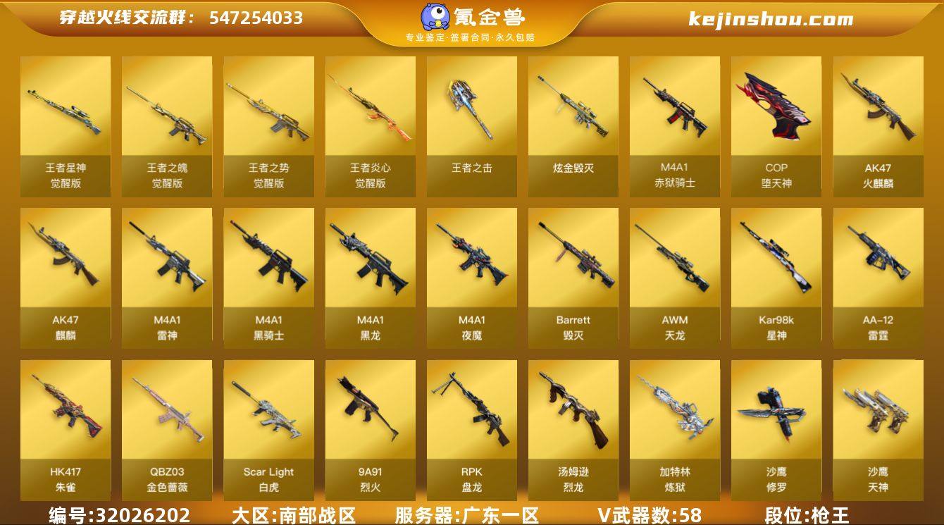 【ky6064】广东一区-63V-5王者武器数-1炫金武器数 【热门武器】:QBZ03-金色蔷薇,Scar Light-白虎,HK417-朱雀,M200-竞技荣光,Kar98K-星神,C.A.T,牛牛-AK47,M4A1-黑骑士,汤姆逊-烈龙*6,RPK-盘龙,加特林-炼狱,COP-堕天神*2,沙鹰-修罗 【王者炫金武器】:王者之击,炫金毁灭 【音效卡】:M4A1-雷神音效卡,M4A1-黑龙音效卡,M4A1-黑骑士音效卡,Barrett-毁灭音效卡,QBZ03-金色蔷薇音效卡 【皮肤】:QBZ03-荣耀世冠EP 皮肤,雷神-暗月,火麒麟-雷神,火麒麟-战神关羽,毁灭-CFS2020,烈火-动感闪耀 皮肤,战神-粉色甜心皮肤 【角色】:鹰,王者玲珑,乔伊教练,修道士,风暴女,娟娟,潘多拉-甜心教官,潜龙队-X,青霞仙子,蜀雪,五号兵器-赛博朋克,雪莉杨,影武者-X 【人偶武器】:C.A.T,牛牛-AK47,闪光弹-小乔 【挑战大师】:冰龙粉碎者-白马银枪,激光毁灭者III-白马银枪,VEPR-12-金魔*2 【英雄级武器】:AK47-火麒麟,AK47-麒麟,M4A1-黑龙,M4A1-雷神,M4A1-黑骑士,HK417-朱雀,Scar Light-白虎,M4A1-夜魔,QBZ03-金色蔷薇,9A91-烈火,王者之魄-觉醒版,王者之势-觉醒版,AK47-B-战神,王者炎心-觉醒版,AWM-天龙,Barrett-毁灭,Kar98K-星神,M200-竞技荣光,王者星神-觉醒版,RPK-盘龙,加特林-炼狱,汤姆逊-烈龙*6,AA-12-雷霆,沙鹰-修罗,沙鹰-天神,COP-堕天神*2,柯尔特-竞技荣光,破空枪刃-夜魔,马来剑-夜魔,麒麟刺*2,擎天-竞技荣光,高爆手雷-夜魔*5,高爆手雷-竞技荣光,闪光弹-夜魔*5,闪光弹-竞技荣光*2,烟雾弹-夜魔*5,烟雾弹-竞技荣光*3,烟雾弹-荣耀世冠EP,M4A1-赤狱骑士 【道具】:云山科技背包,冰冰企鹅背包-猛男专用,战舰背包,炫彩背包,超级背包,女皇终结者-魔龙之吻,救世主-黑桃战神,绿色巨人,灵魂忍者,迷雾幽灵,生化弹匣,夺命之镰,防化服*3,流光-再...