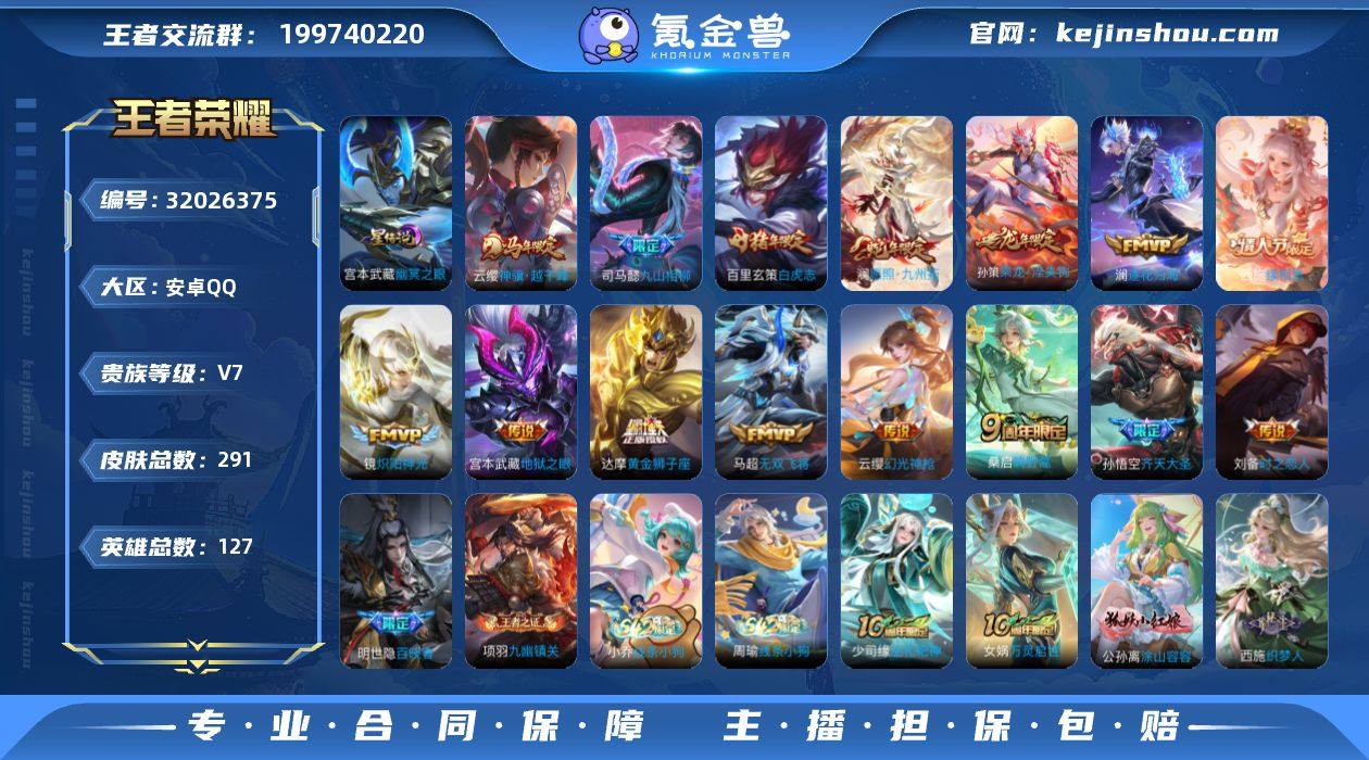 【特价出售/店主推荐/1省标/2市标/32段打野】:安卓Q-V7-最强王者段位-127英雄-291皮肤-2星元-15传说-86史诗 【英雄全皮】:司马懿全皮,孙权全皮,敖隐全皮,戈娅全皮,空空儿全皮,影全皮 【传说皮肤】:云缨神骥越千峰,司马懿九山相柳,西施续相思,澜愿照九州拓,云缨幻光神枪,桑启鸣野蒿,孙策乘龙淬吴钩,澜逐花归海,孙悟空齐天大圣,马超无双飞将,镜炽阳神光,刘备时之恋人,达摩黄金狮子座,百里玄策白虎志,宫本武藏地狱之眼 【限定皮肤】:暃埋骨钱,蒙犽顽岩魄,蔡文姬夏日便利店,虞姬夏日便利店,姜子牙天穹之誓,李白谪仙醉月,狄仁杰阴阳师,赵云皇家上将,孙尚香蔷薇恋人,扁鹊奇幻香踪,元歌无心,狄仁杰魔术师,达摩沙漠行僧,项羽海滩派对,老夫子航海奇遇记,韩信傲雪梅枪,兰陵王金庭之子,亚瑟潮玩骑士王,孙悟空齐天大圣,李元芳云中旅人,钟馗驱傩正仪,杨戬潮玩骑兵,干将莫邪胡桃夹子,鬼谷子五谷丰年,苏烈千军破阵,百里玄策白虎志,梦奇顽趣,沈梦溪大漠名商,沈梦溪匿光破解者,裴擒虎李小龙,裴擒虎擒涛扼浪,云中君纤云弄巧,盾山梦圆繁星,上官婉儿梁祝,嫦娥拒霜思,西施玲珑珍味,西施至美乘鲤谣,鲁班大师探海日志,桑启海盐诗旅,戈娅驭风魔法,阿古朵江河有灵,张良古海寻踪,蒙犽百解令,高渐离燃音魔法,妲己灵卜魔法,鬼谷子天穹祈灯,伽罗琥珀纪元,孙策乘龙淬吴钩,百里玄策超元猎域,沈梦溪龙舞盛年,刘邦剑破天穹,程咬金群星魔术团,刘备异域游侠,周瑜熔金海岸 【年限皮肤】:百里玄策白虎志,孙策乘龙淬吴钩,澜愿照九州拓 【赛季限定】:钟馗驱傩正仪,苏烈千军破阵,达摩沙漠行僧,兰陵王金庭之子,沈梦溪大漠名商,李元芳云中旅人,桑启海盐诗旅,裴擒虎擒涛扼浪,鲁班大师探海日志,张良古海寻踪,鬼谷子天穹祈灯,刘邦剑破天穹,姜子牙天穹之誓,东皇太...