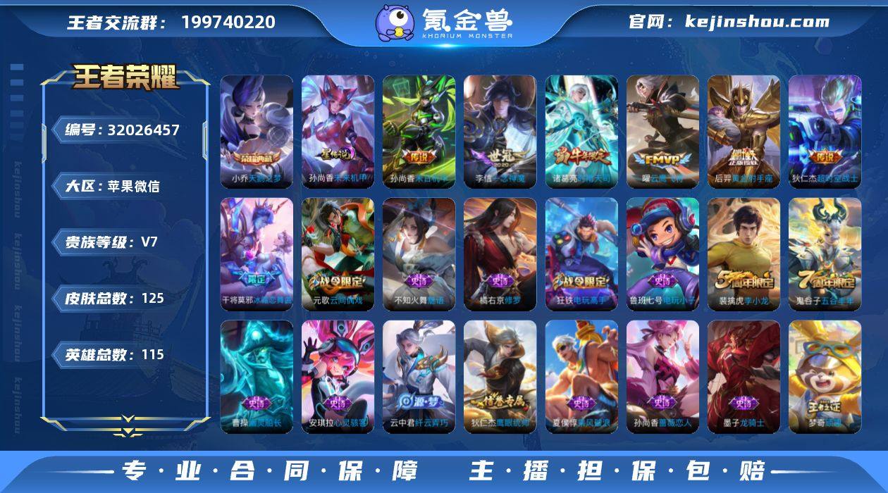 【金标干将莫邪】实名: 可修改 贵族等级: V7 英雄数: 115 皮肤数: 125 荣耀水晶: 天鹅之梦 星传说: 未来机甲 传说皮: 黄金射手座,云鹰飞将,一念神魔,末日机甲-孙尚香,超时空战士-狄仁杰 限定皮: 李小龙,时雨天司,冰霜恋舞曲,五谷丰年