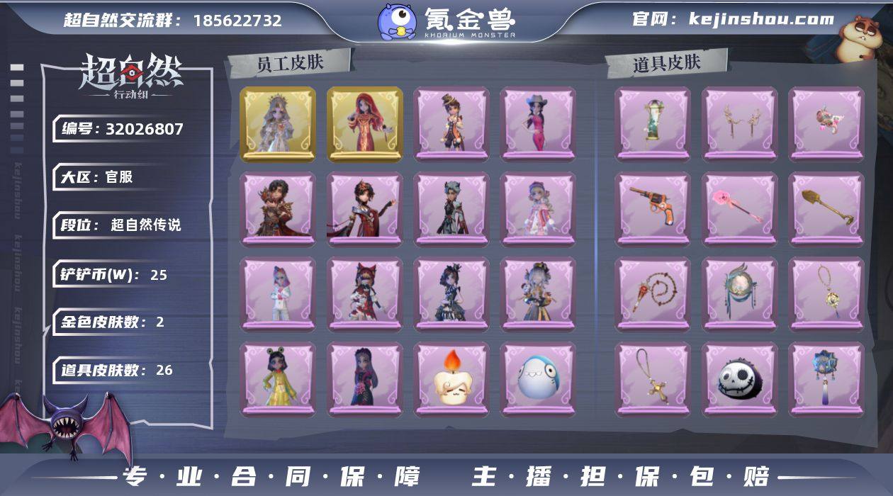 金色皮肤数量: 2 紫色皮肤数量: 12 道具皮肤数量: 26 段位: 超自然传说 员工: 逍遥,薇薇安,巫铃儿,莉莉,阿念,艾伦,小黄,零,爱丽丝,爱德华,兰,小满,临云 外观: 圣光之谕,镜花辞,丝缕哀歌,嘻嘻头套,烈焰红唇头套,呆滞头套,炙热烧烤,卑微头套,哈士奇头套,滑稽头套,鱼头怪头套,面具马头套,萨卡班甲鱼头套,小狗蛇点点头套,蝶恋花,天使消失的年代,钗头凤,呱呱雨衣,除妖小师妹,梵音莲华,九色祥鹿,火爆了头套,异色序曲,精致露比头套,惊魂南瓜,莓果陷阱,糖果守卫,甜梦派对,绒绒对决,班卓琴,樱桃奶油布丁,仙锋小姐,搬开山,雪墩墩头套,太空鲨头套,尘封旧事,子夜证词,黎明猎手,耀眼的你,庆宴绮愿,炽天使的余烬,晚安小熊,烛光纪念,醉花阴,牛啤背包