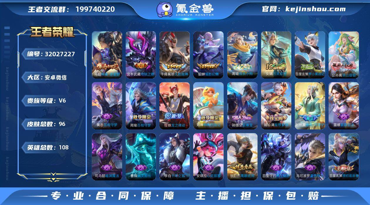 安卓WX-V6-最强王者段位-108英雄-96皮肤-4传说-31史诗 【英雄全皮】:孙权全皮,敖隐全皮 【传说皮肤】:马超神骥逐星野,貂蝉猫影幻舞,干将莫邪久胜战神,宫本武藏地狱之眼 【限定皮肤】:狄仁杰阴阳师,赵云皇家上将,狄仁杰魔术师,项羽海滩派对,孙悟空至尊宝,百里玄策原初追逐者,裴擒虎擒涛扼浪,嫦娥暖冬兔眠,桑启海盐诗旅,张良古海寻踪,姬小满妄想食味,沈梦溪龙舞盛年 【赛季限定】:桑启海盐诗旅,裴擒虎擒涛扼浪,张良古海寻踪,太乙真人谧流熔炉,钟馗虚灵犬护,甄姬逆浪荇歌,亚瑟荣光之誓,百里玄策原初追逐者 【战令限定】:嫦娥暖冬兔眠,刘禅鸭鸭历险记,沈梦溪鸭鸭历险记,周瑜百相守梦,孙策百相守梦,周瑜线条小狗 【史诗皮肤】:周瑜线条小狗,女娲万灵启世,百里玄策罗小黑战记,公孙离涂山容容,黄忠百相守梦,周瑜百相守梦,狂铁龙之律动,刘禅鸭鸭历险记,赵怀真器灵浮梦炉,马可波罗星界特工,姬小满妄想食味,司马懿暗渊魔法,百里玄策热力回旋,百里玄策原初追逐者,狄仁杰鹰眼统帅,阿轲节奏热浪,李元芳逐浪之夏,百里守约特工魅影,安琪拉心灵骇客,兰陵王暗隐猎兽者,刘邦德古拉伯爵,孙悟空至尊宝,张飞乱世虎臣,李白千年之狐,曹操幽灵船长,妲己魅力维加斯,孙尚香水果甜心,宫本武藏鬼剑武藏,狄仁杰魔术师,赵云未来纪元,赵云皇家上将,露娜紫霞仙子 【其他皮肤】:蚩奼极光幻客,艾琳鹤鸣心笺,孙权径山谋武,亚瑟荣光之誓,哪吒罗小黑战记,鬼谷子克喵,莱西奥踏浪烽翎,庄周锦麟游梦,孙策百相守梦,甄姬逆浪荇歌,白起死霸装,姬小满小满鸭,露娜命运加冕,阿古朵布丁狗之约,张良灵野札记,苏烈春野闲踪,沈梦溪鸭鸭历险记,钟馗虚灵犬护,西施雪境奇遇,典韦铁骨偃魂,太乙真人谧流熔炉,沈梦溪龙舞盛年,海月王牌新星,张良古海寻踪,裴擒虎擒涛扼浪,海月幻...