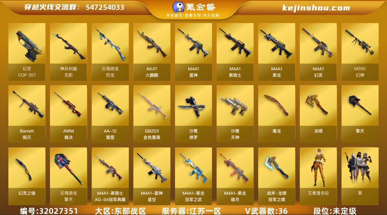 江苏一区-42V-2王者武器数-0炫金武器数 【热门武器】:QBZ03-金色蔷薇,M14EBR-玄武,M200-幻神,死亡之眼*3,M4A1-黑骑士,雷神-小红,COP-白鲨*2,COP 357-幻灵,沙鹰-修罗*2,Knife-冠军之刃 【音效卡】:M4A1-黑骑士音效卡 【皮肤】:幻神-冠军之幻,QBZ03-荣耀世冠白鲨,金色蔷薇-破浪逐光 皮肤,金色蔷薇-电竞之星 皮肤,雷神-星空,M4A1-雷神-巅峰荣耀皮肤,雷神-源计划2.0专属 皮肤,黑龙-暗月,黑龙-冠军之武,黑骑士-AG-S4冠军典藏,修罗-能量核心,屠龙-破浪逐光 皮肤,龙啸-冠军之啸 【角色】:葵,鹰,隼,王者潘多拉,修道士,云海玲珑,嘉年华灵狐,荆棘玫瑰,灵狐者-X,麻雀 【人偶武器】:雷神-小红,COP-白鲨*2,AWM-灵狐-15周年嘉年华,迷你波特博士*2,迷你火种*2 【暴走生化】:死亡之眼*3 【挑战大师】:激光毁灭者III-白马银枪,激光毁灭者III,试炼破坏者III 【英雄级武器】:AK47-火麒麟,M4A1-黑龙,M4A1-雷神,M4A1-黑骑士,M4A1-幻灵,M14EBR-玄武,无影-神兵利器,QBZ03-金色蔷薇,HK417-朱雀-电竞之星,Barrett-毁灭,AWM-裁决,M200-幻神,王者风神-觉醒版,王者凰鸣-觉醒版,烈龙-云海游龙,AA-12-雷霆,沙鹰-修罗*2,沙鹰-天神*2,COP 357-幻灵,屠龙,龙啸,擎天,幻灵之锋,擎天-云海游龙,高爆手雷-幻灵*2,高爆手雷-竞技荣光,高爆手雷-云龙,手雷-云海游龙,闪光弹-幻灵*2,闪光弹-云龙,烟雾弹-幻灵*2 【道具】:XROCK炫彩背包,云海游龙炫彩背包,夺命之镰,防化服,金色流光-枪王排位,星辰流光-枪王排位,枪王排位28赛季金色流光,枪王排位29赛季金色流光,云海游龙表情,防弹头盔*3,防弹衣*3,C4工具钳*3,手雷包*3 【特殊枪械】:1黑骑士